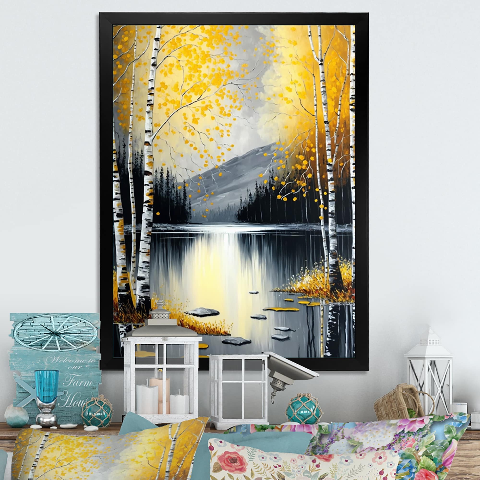 Designart "Monochrome Golden Birch Trees By the Lake I" Landscape Framed Art Print
