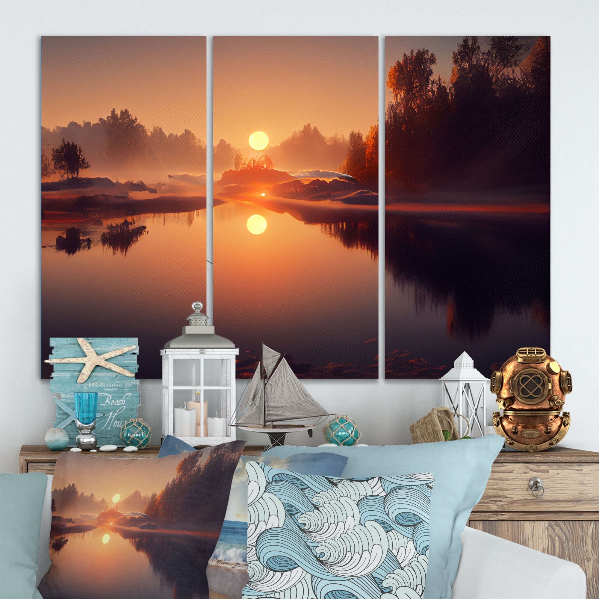 Designart "Morning Fog Over the Lake Sunset VI" Landscape Lake Canvas Wall Art Print