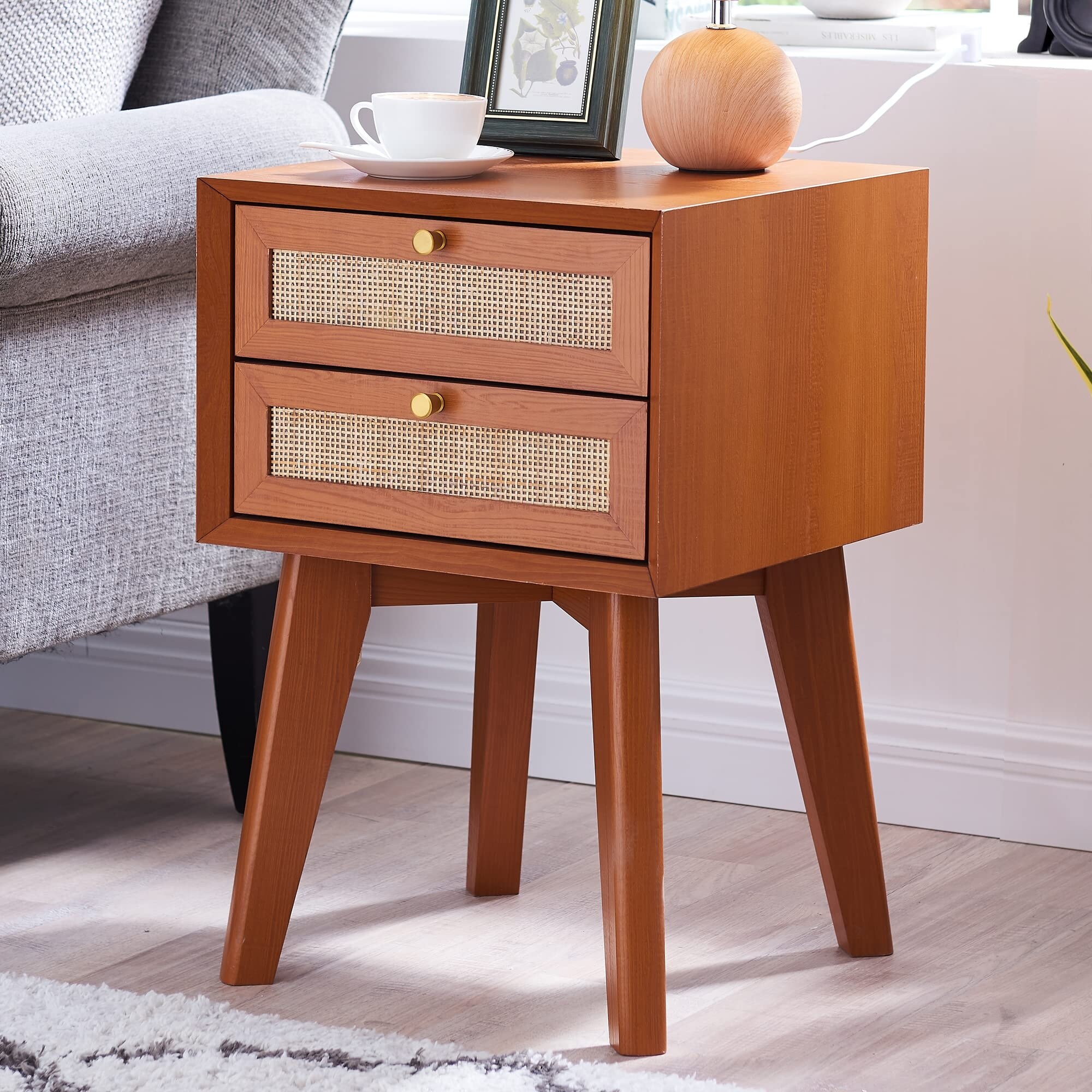 Rattan Nightstand Mid Century Modern End Table Boho Side Table with Storage Drawers Solid Wood Night Stand Sofa Side Table
