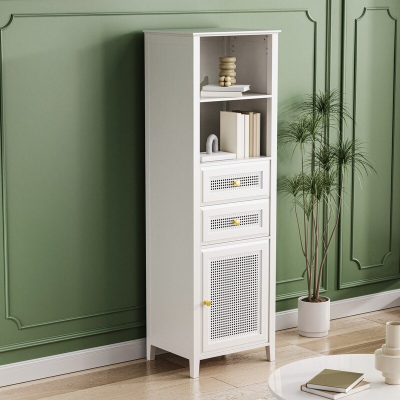 Boho Style Slim Tall Cabinet with Rattan Door, Mid Century Modern Tower Cabinet Up to 63"