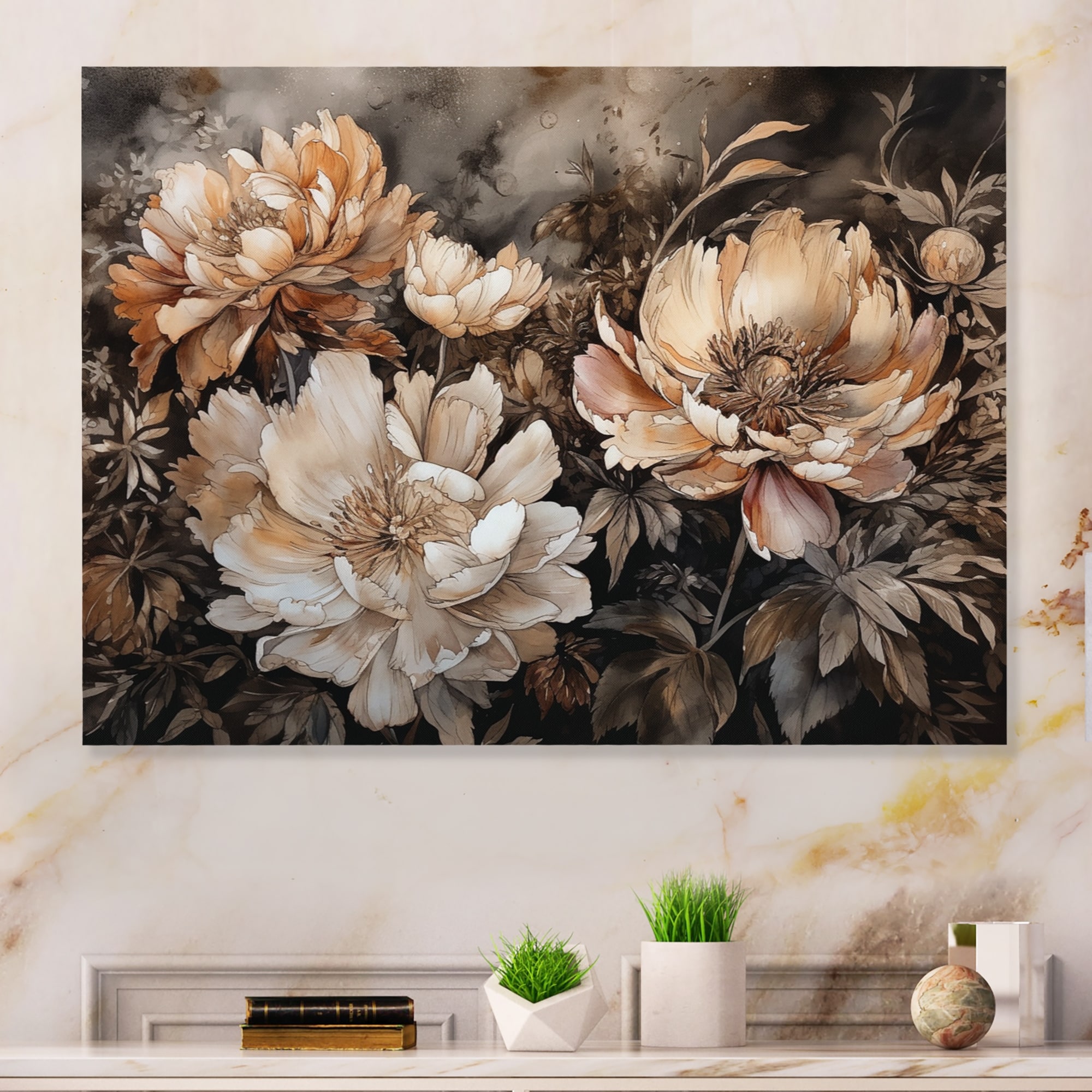 Designart "Cream Brown Peony Blooms in Motion" Floral Peony Metal Wall Art