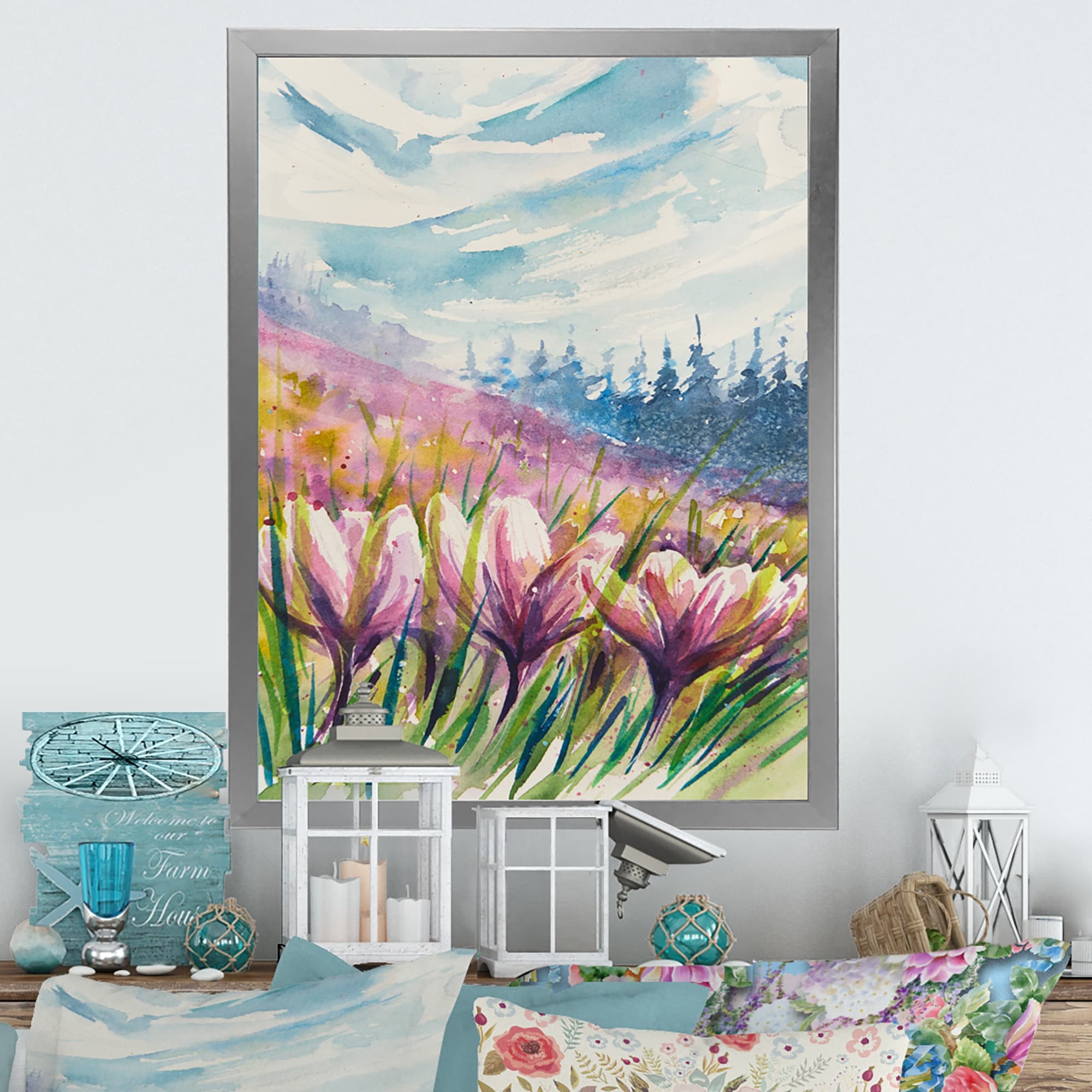 Designart "Crocuses Meadow in Abstract Mountains" Traditional Framed Wall Art