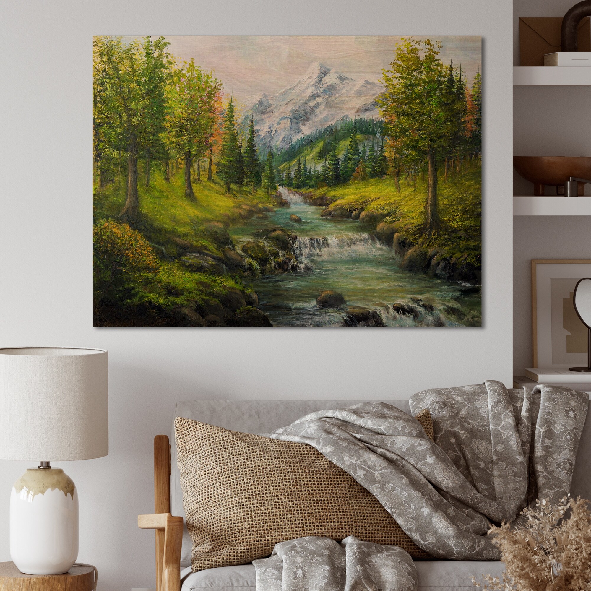 Designart 'Beautiful Spring River in Mountain III' Traditional Wood Wall Art Panels - Natural Pine Wood