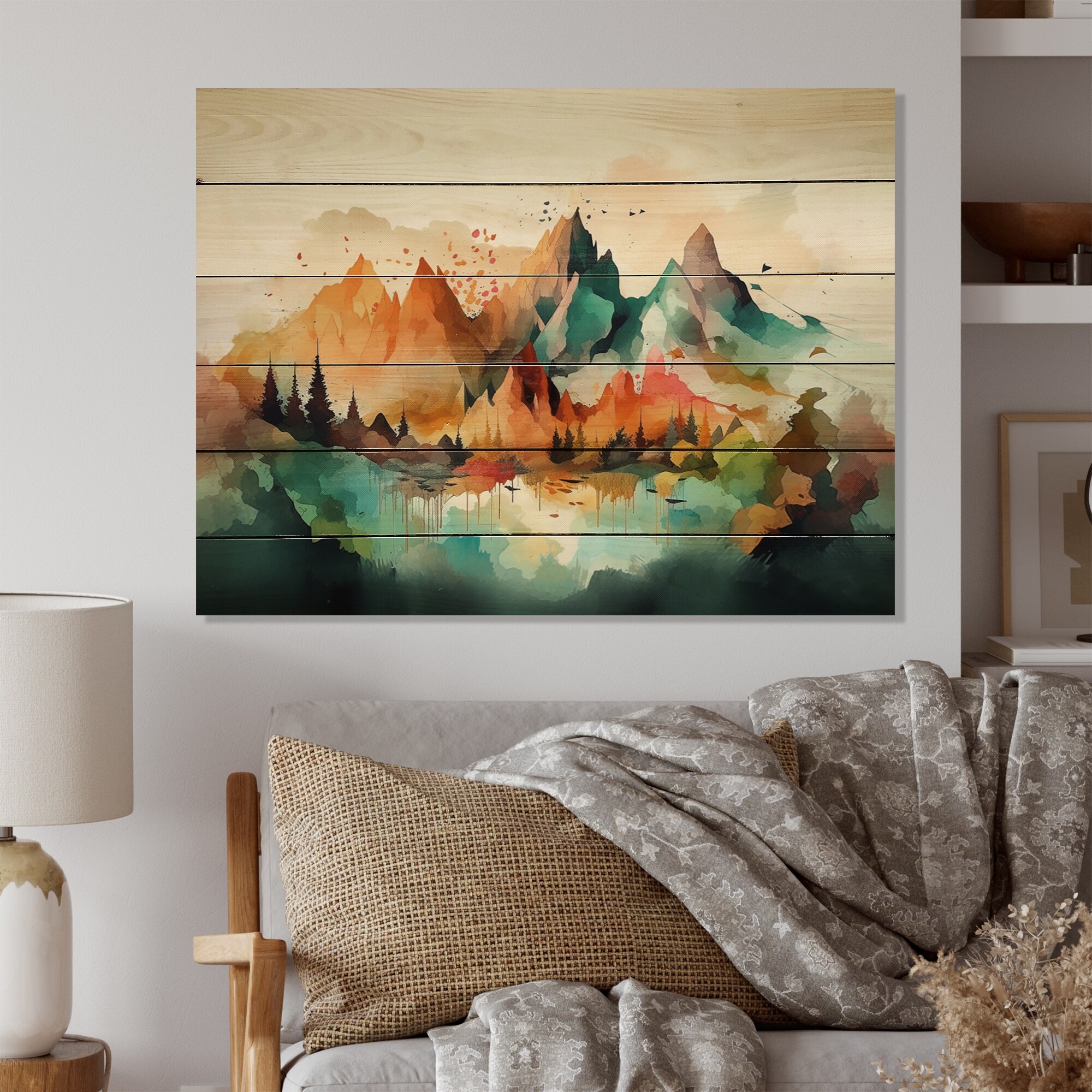 Designart "Mountain Reflection on Lake II" Landscape Mountains Lake Print on Natural Pine Wood