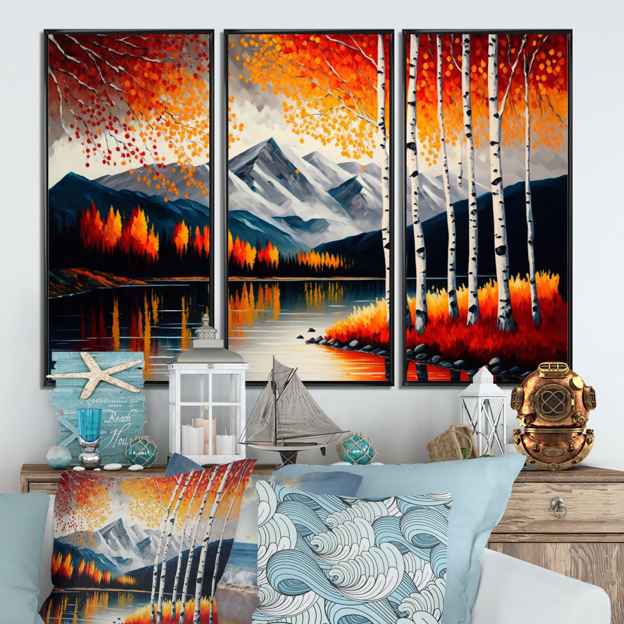 Designart "Red And Orange Birch Trees By the Lake III" Landscape Lake Mountains Framed Canvas Art Print - 3 Panels