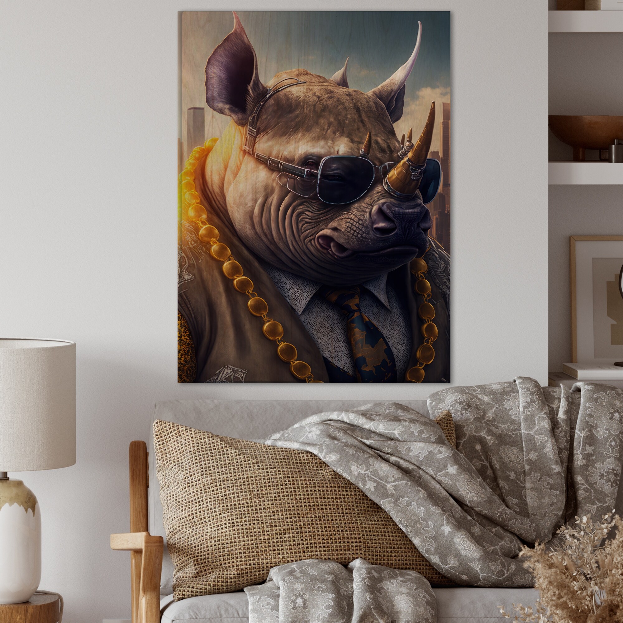 Designart 'Rhino Gangster in NYC I' Animals Rhino Gangster Mafia Wood Wall Art - Natural Pine Wood