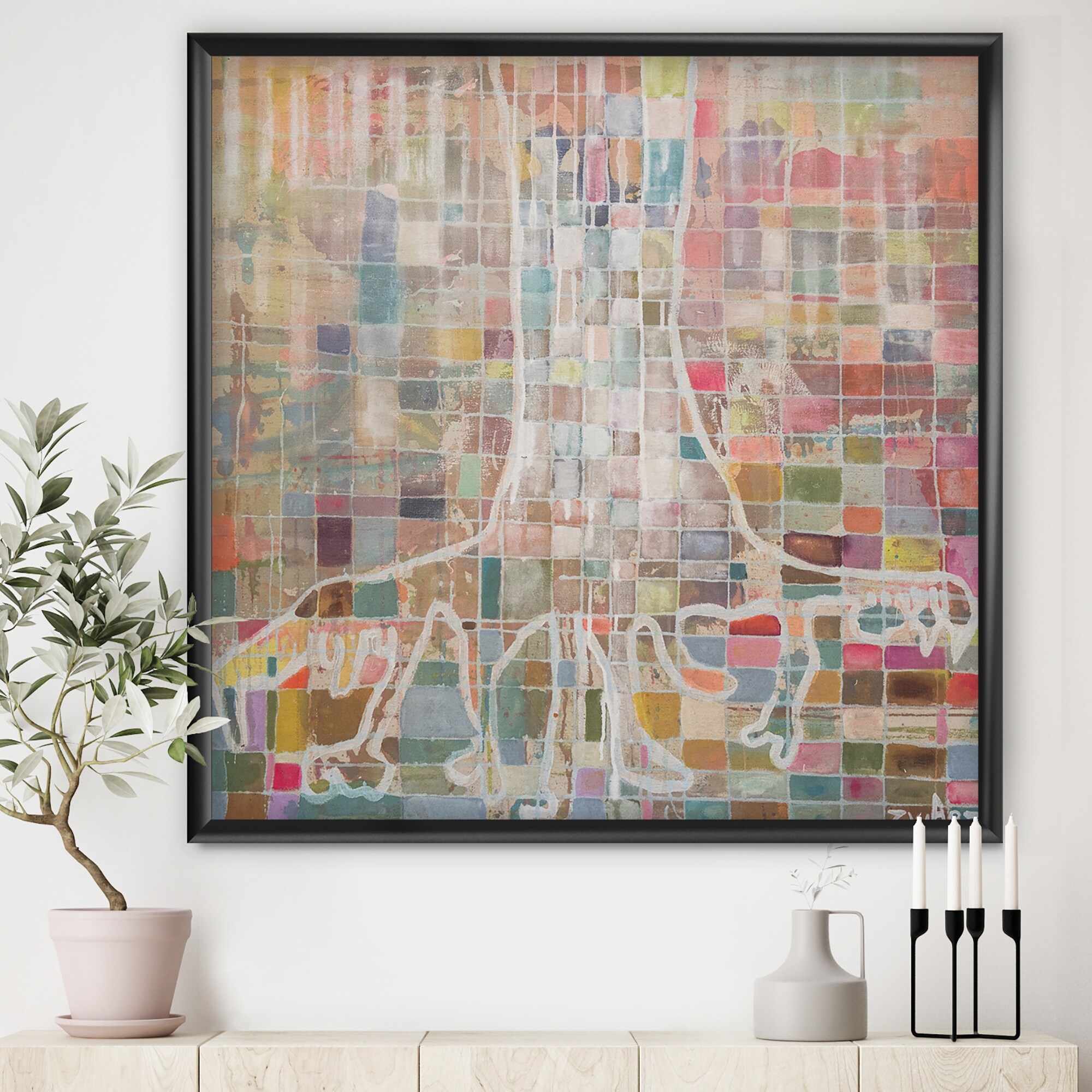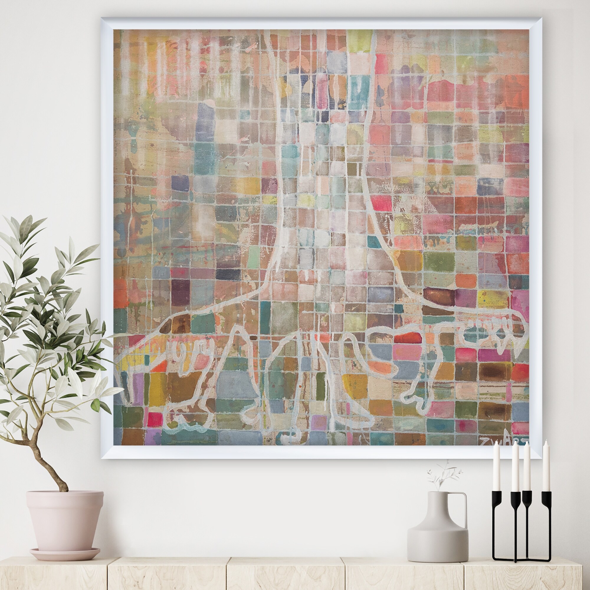 Designart "White Tree on Colorful Grid II" Modern & Contemporary Framed Art Print