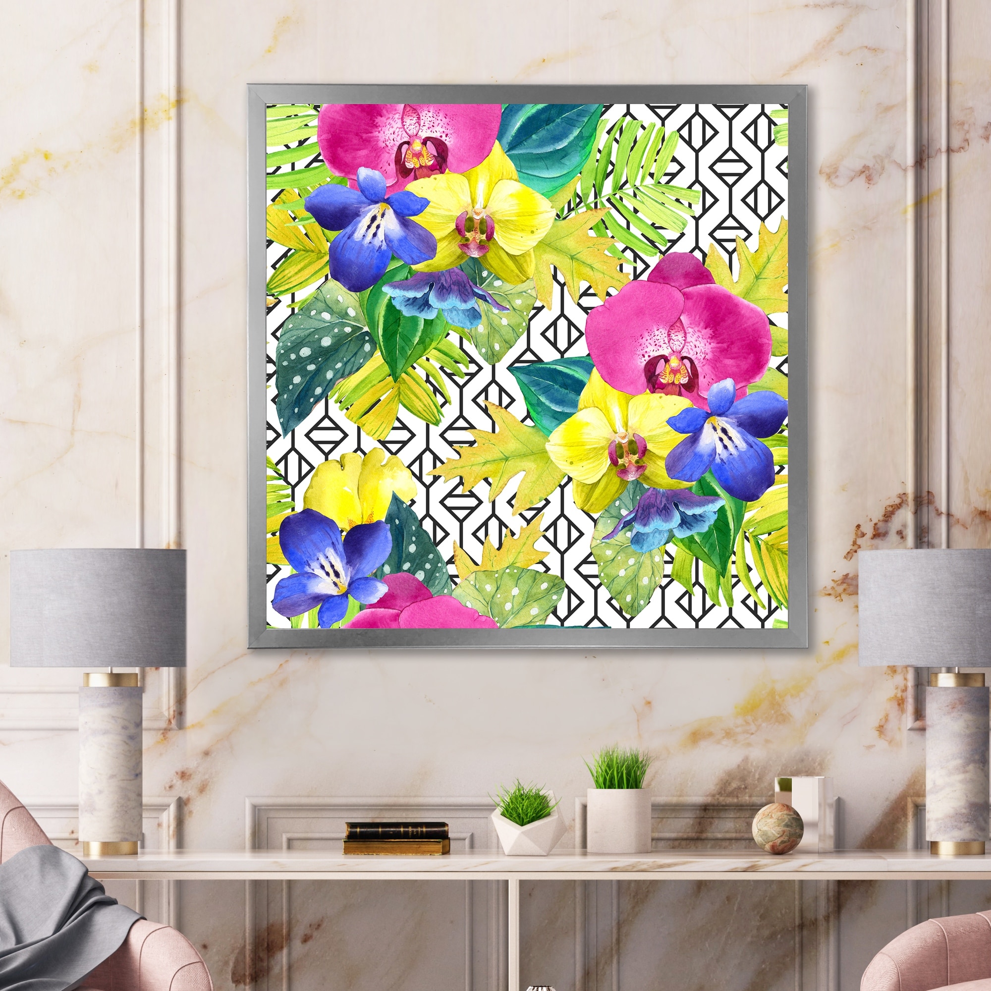 Designart "Yellow Blue And Fuchia Orchids on Organic Grid" Tropical Framed Art Print