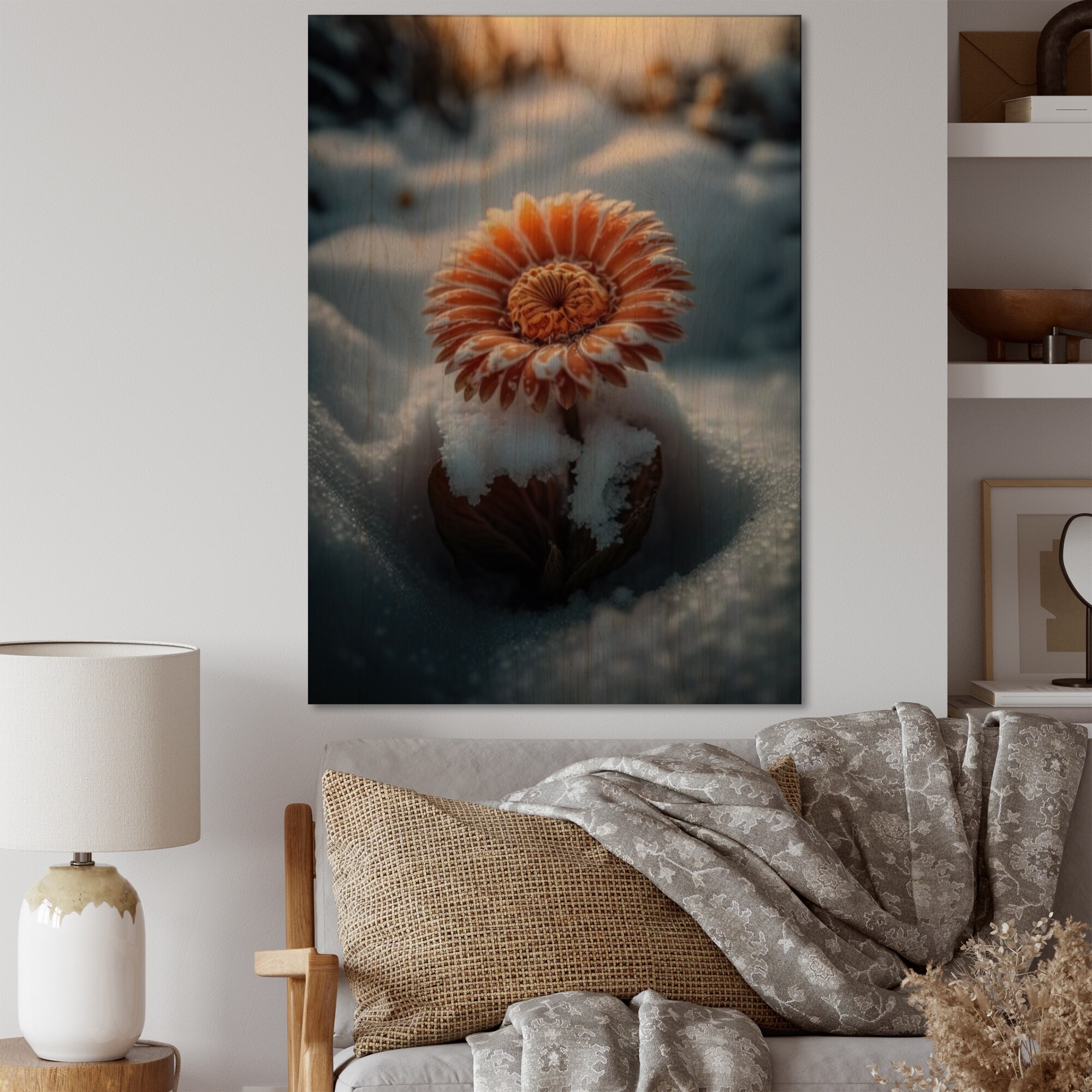 Designart 'A Blooming Light Orange Gerbera Flower in Winter II' Floral Daisy Wood Wall Art - Natural Pine Wood