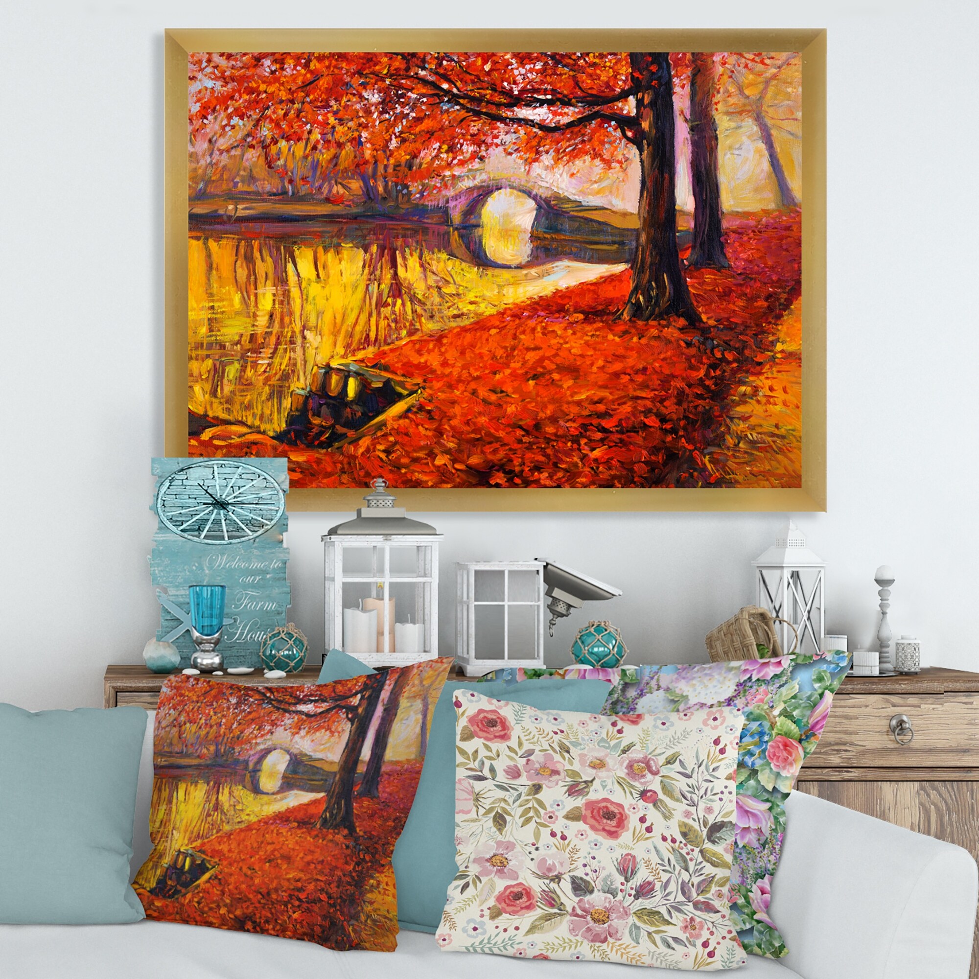 Designart "Little Bridge in Orange Autumn Landscape I" Traditional Framed Art Print