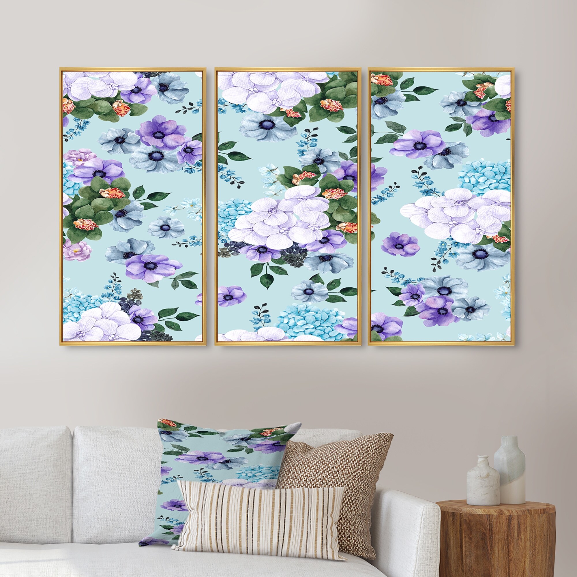 Designart "White And Orange Flowers on Light Blue" Patterned Framed Canvas Wall Art Print Set of 3 - 4 Colors of Frames