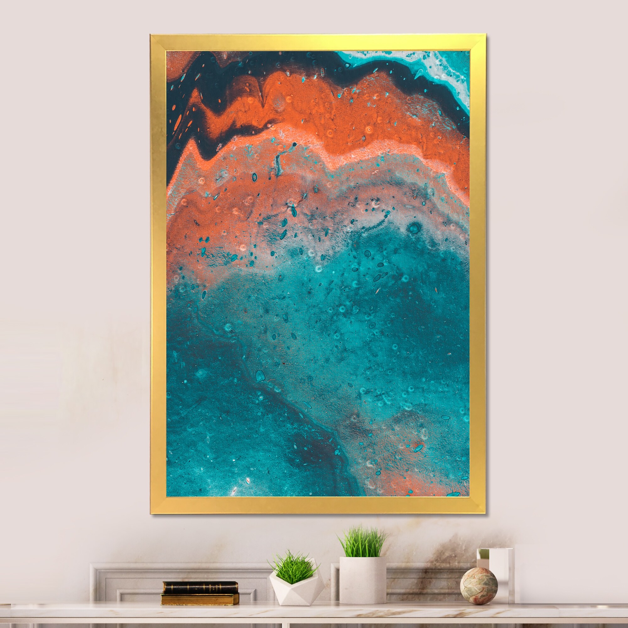 Designart "Orange And Turquoise Marble Art II" Modern Framed Art Print