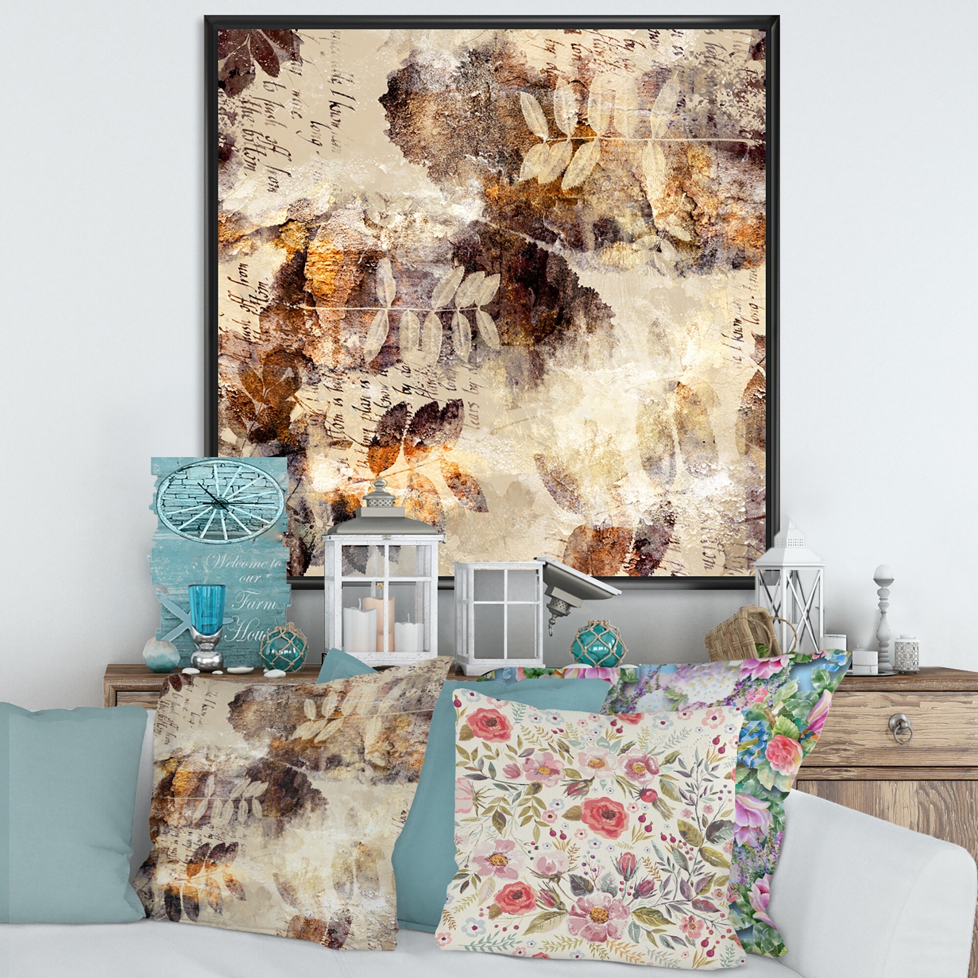 Designart "Brown Orange And Grey Grunge Pattern" Patterned Framed Canvas Wall Art Print