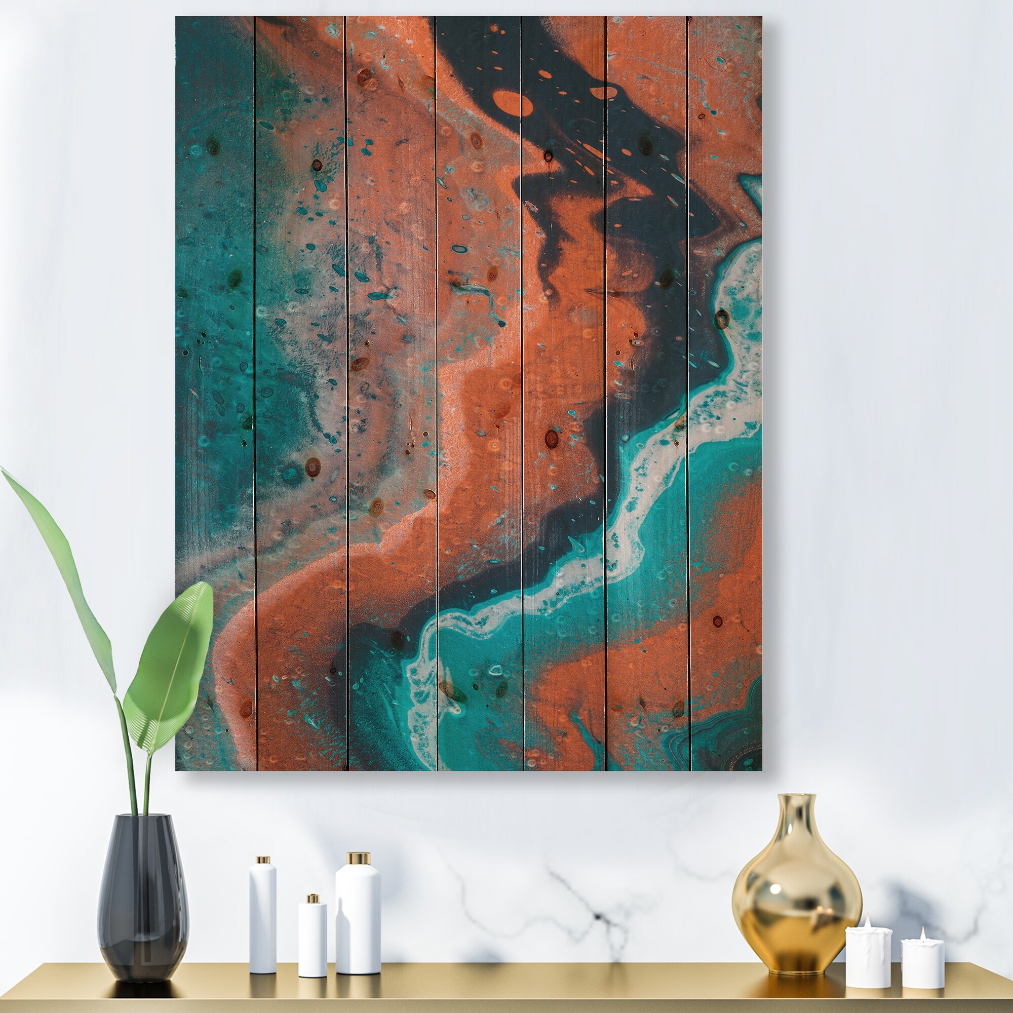 Designart 'Abstract Marble Composition in Blue and Orange I' Modern Print on Natural Pine Wood