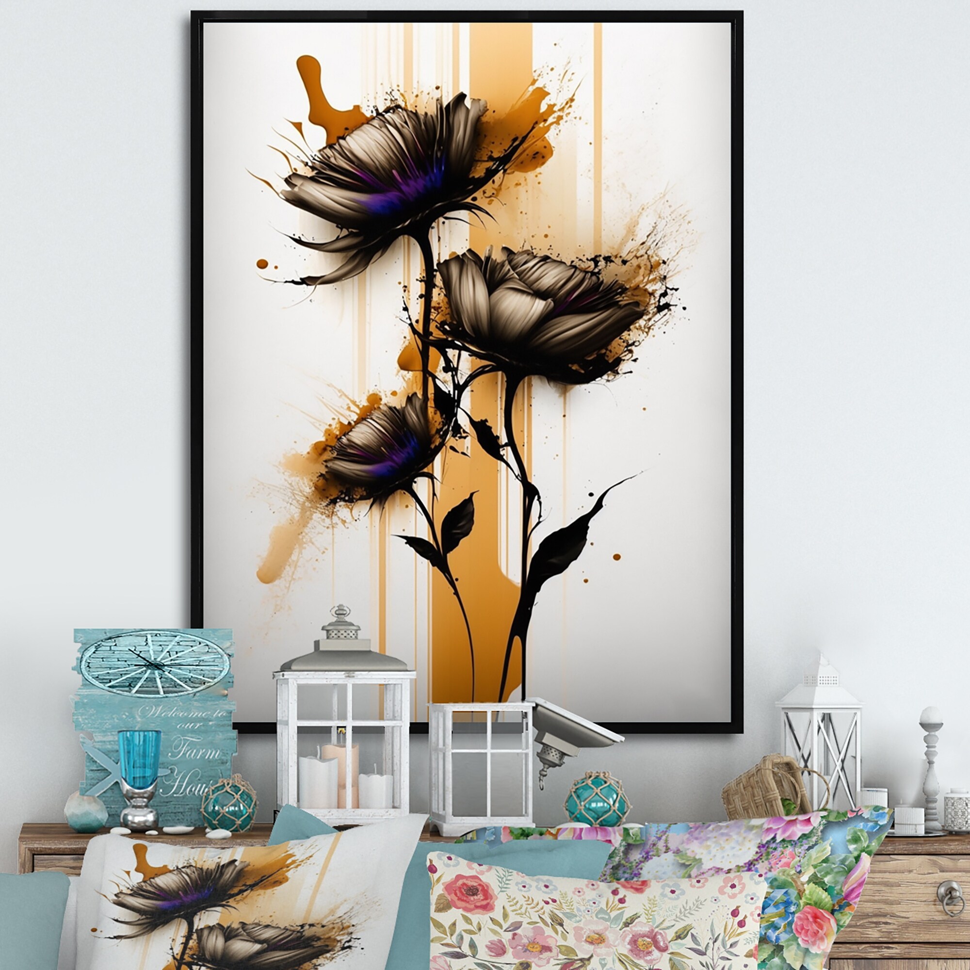 Designart "Orange Daisy Flower on Abstract Fusion II" Floral & Botanical Framed Canvas Art Print