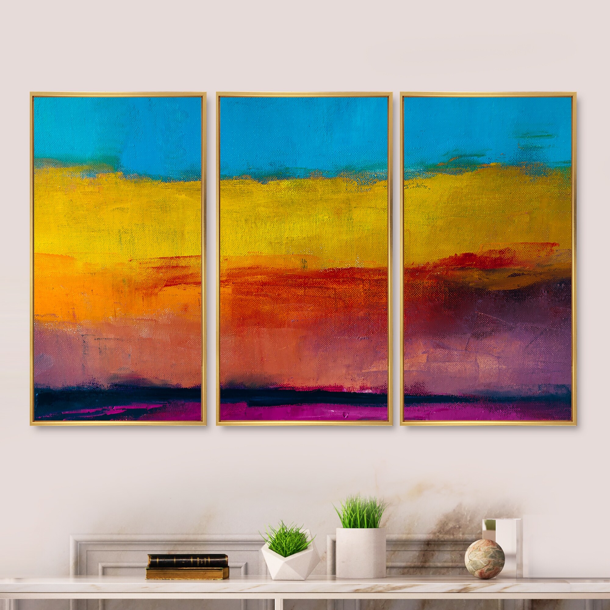 Designart "Yellow Blue Orange in Abstract Painting background" Contemporary Framed Canvas Wall Art Print - 3 Panels