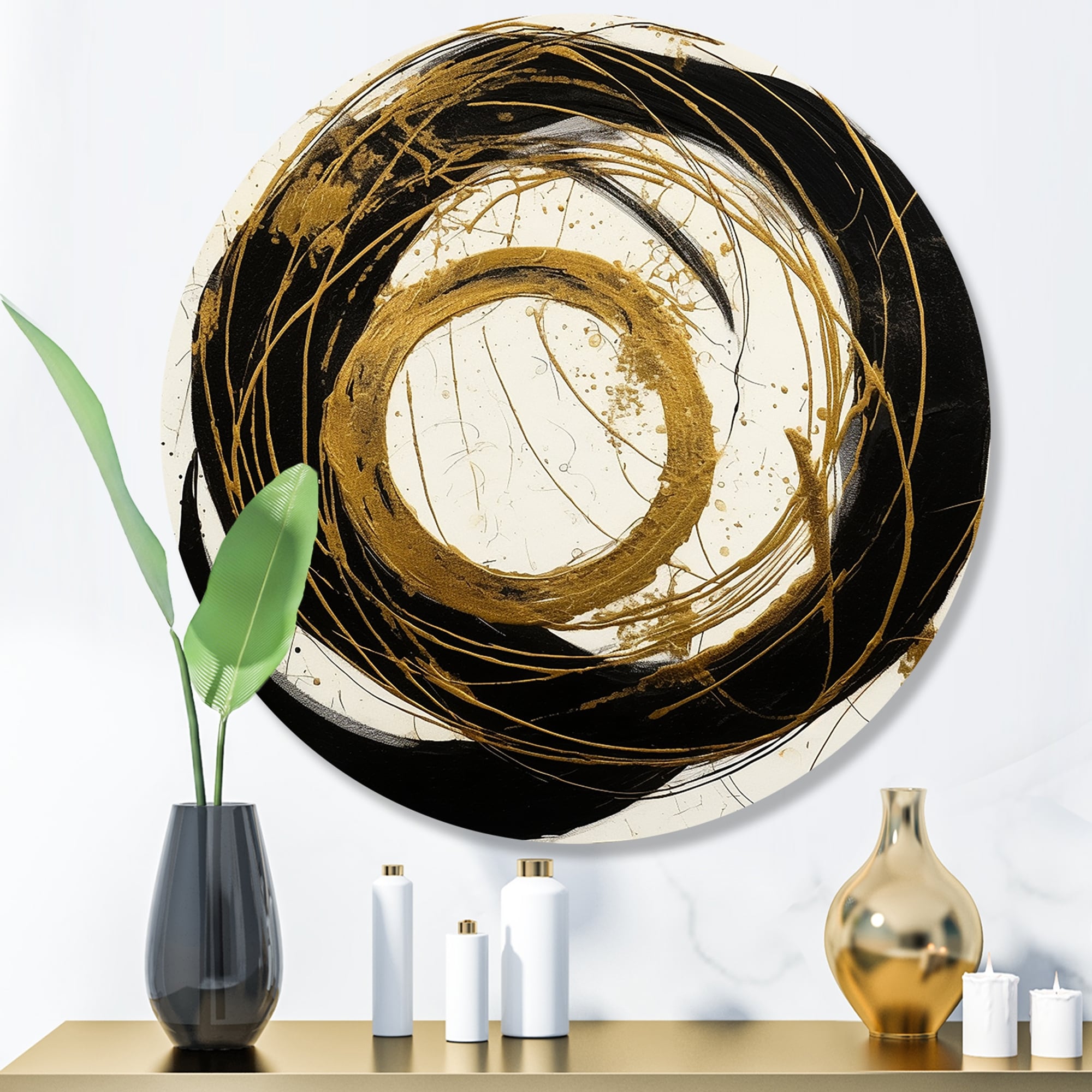 Designart "Black And Gold the Art of Chaos III" Abstract Painting Metal Round Wall Art