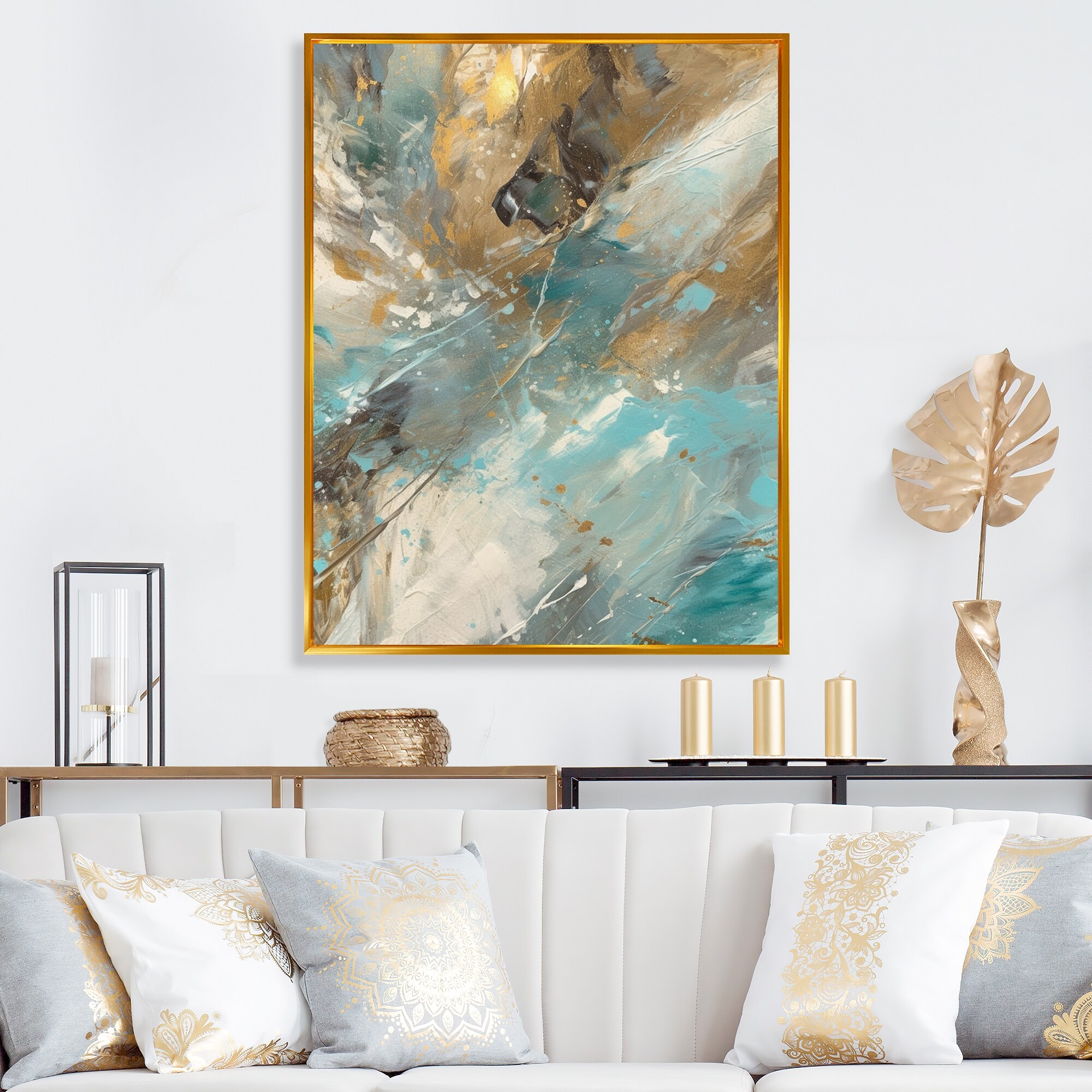 Designart "Golden Hour in Turquoise Waves I" Abstract Painting Framed Wall Art Living Room