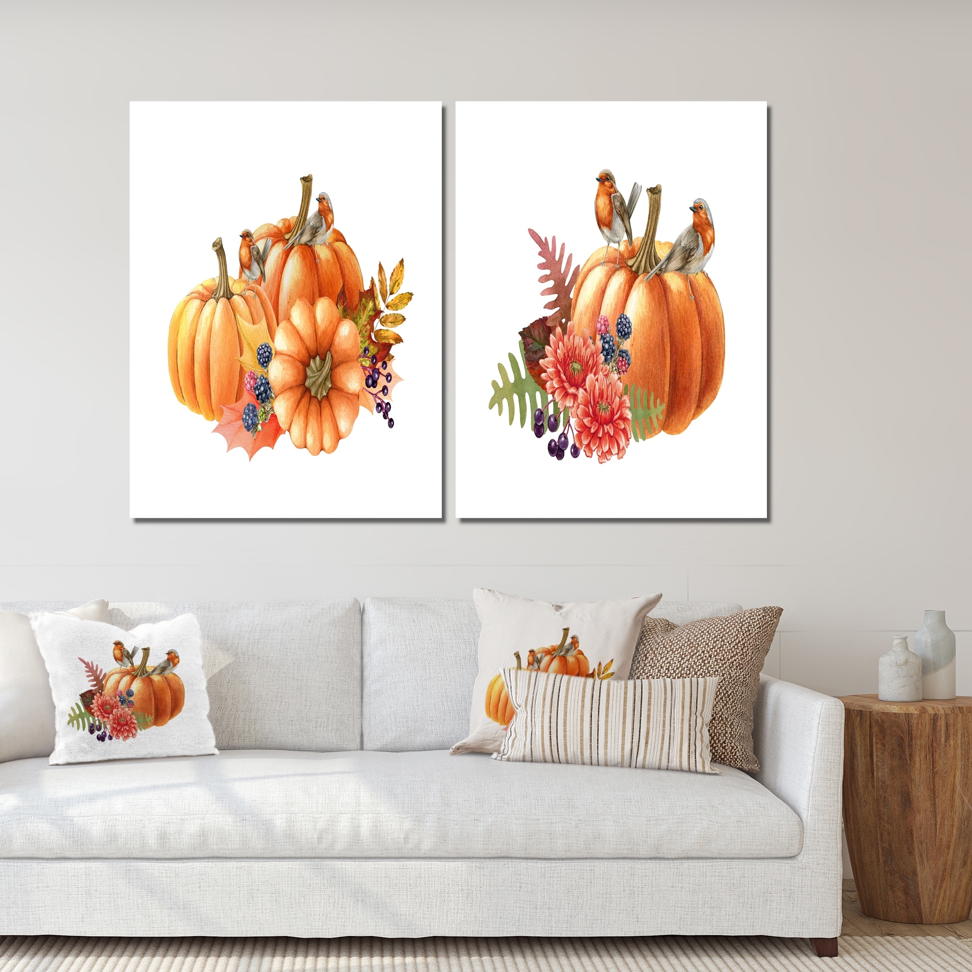Designart 'Pumpkin And Birds on White' Casual Art Set of 2 Pieces