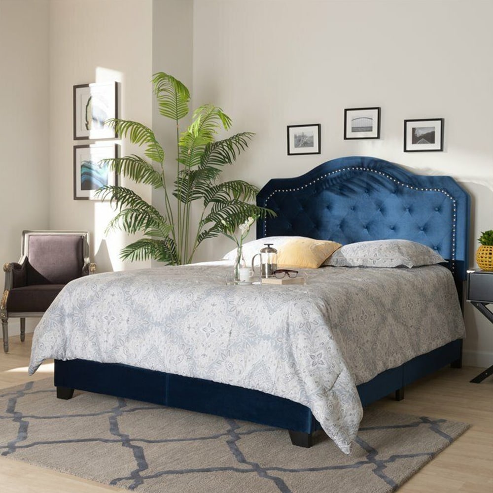 Queen Size Velvet Upholstered Button Tufted Bed Navy Blue