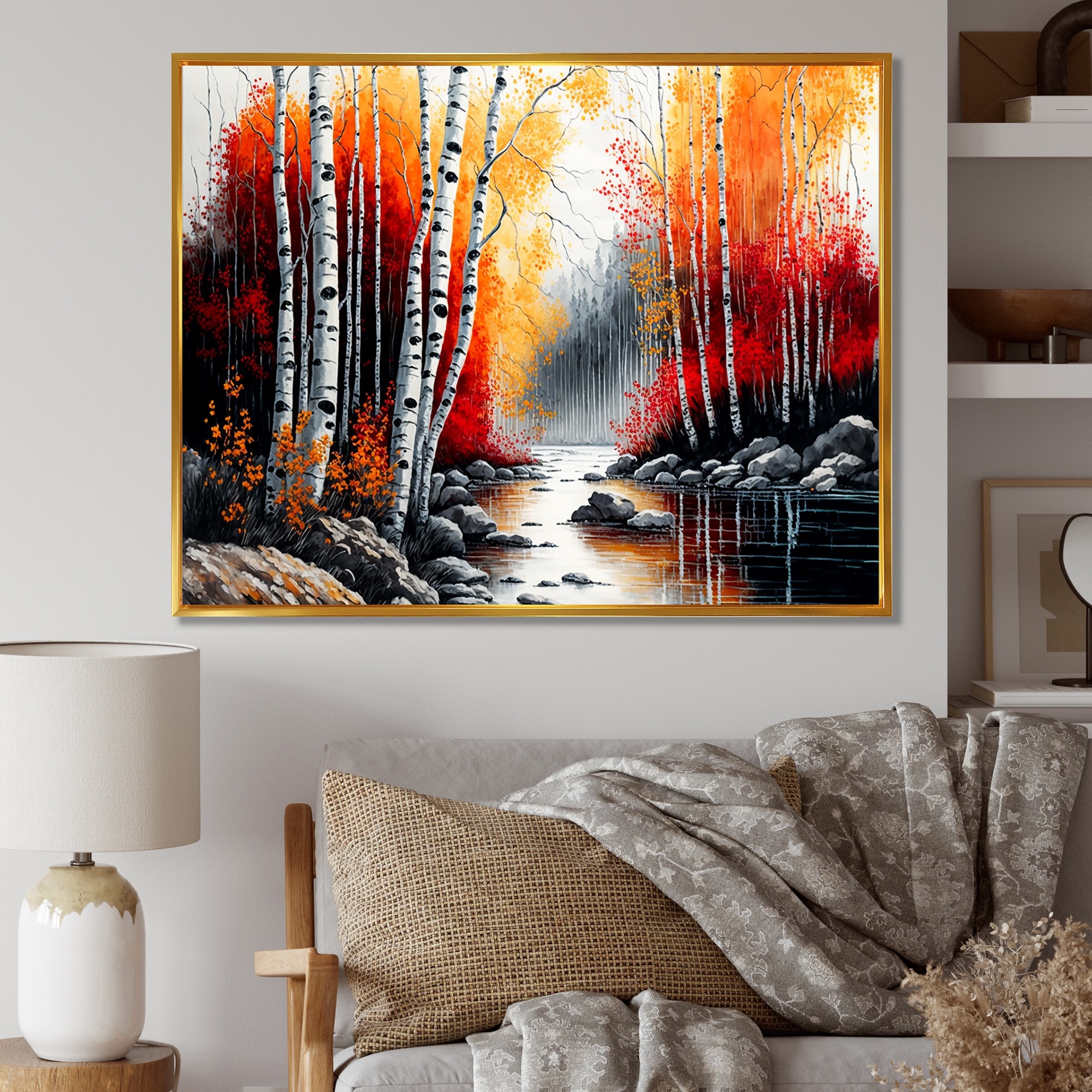 Designart "Red And Orange Birch Trees By the River" Landscape Framed Canvas Art Print