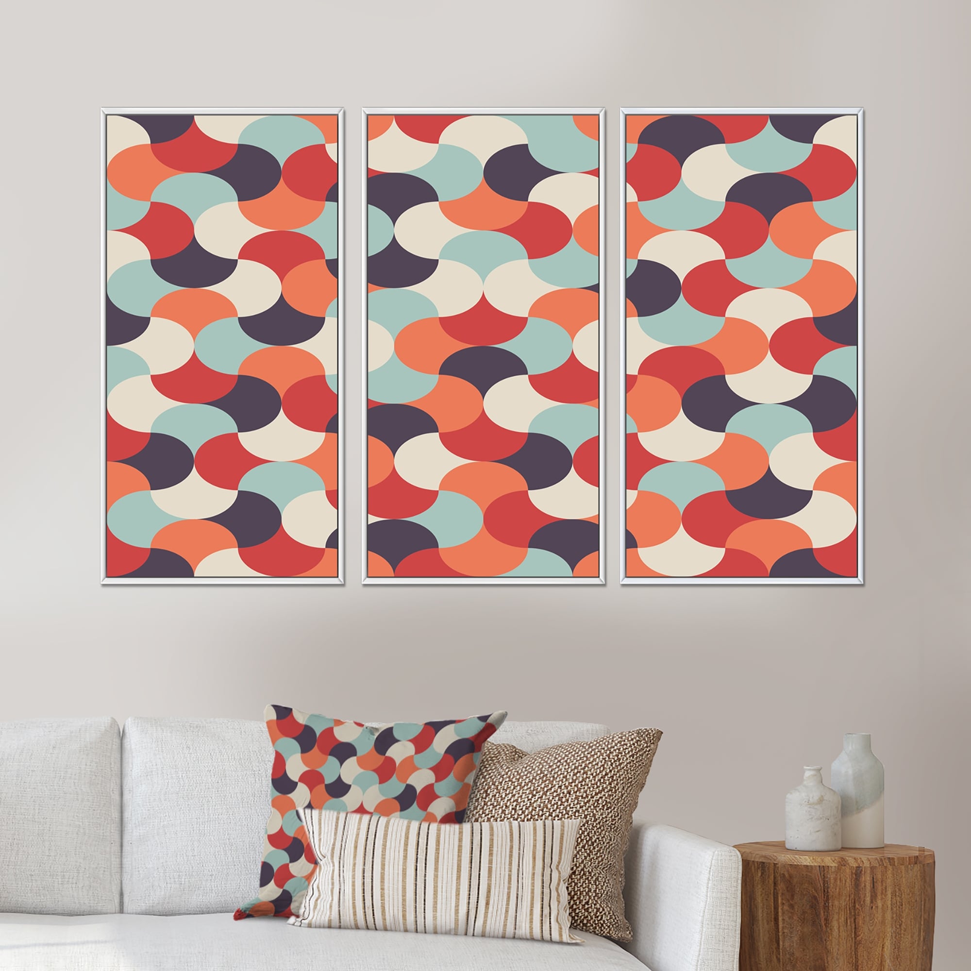Designart "Retro Mosaic Geometrics in Red Blue And Orange" Patterned Framed Art Set of 3 - 4 Colors of Frames
