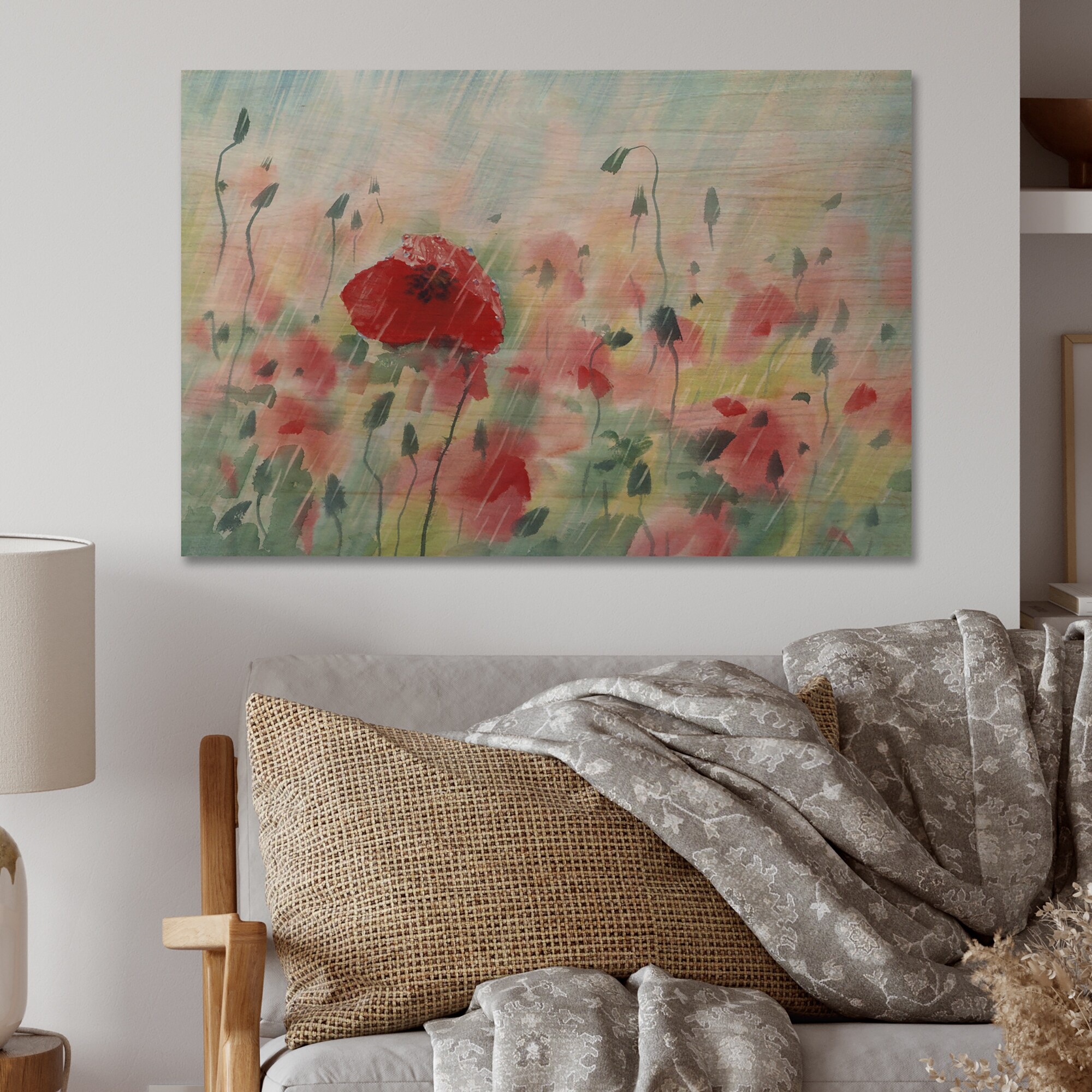 Designart 'Red Poppy Field Under the Rain' Traditional Wood Wall Art - Natural Pine Wood