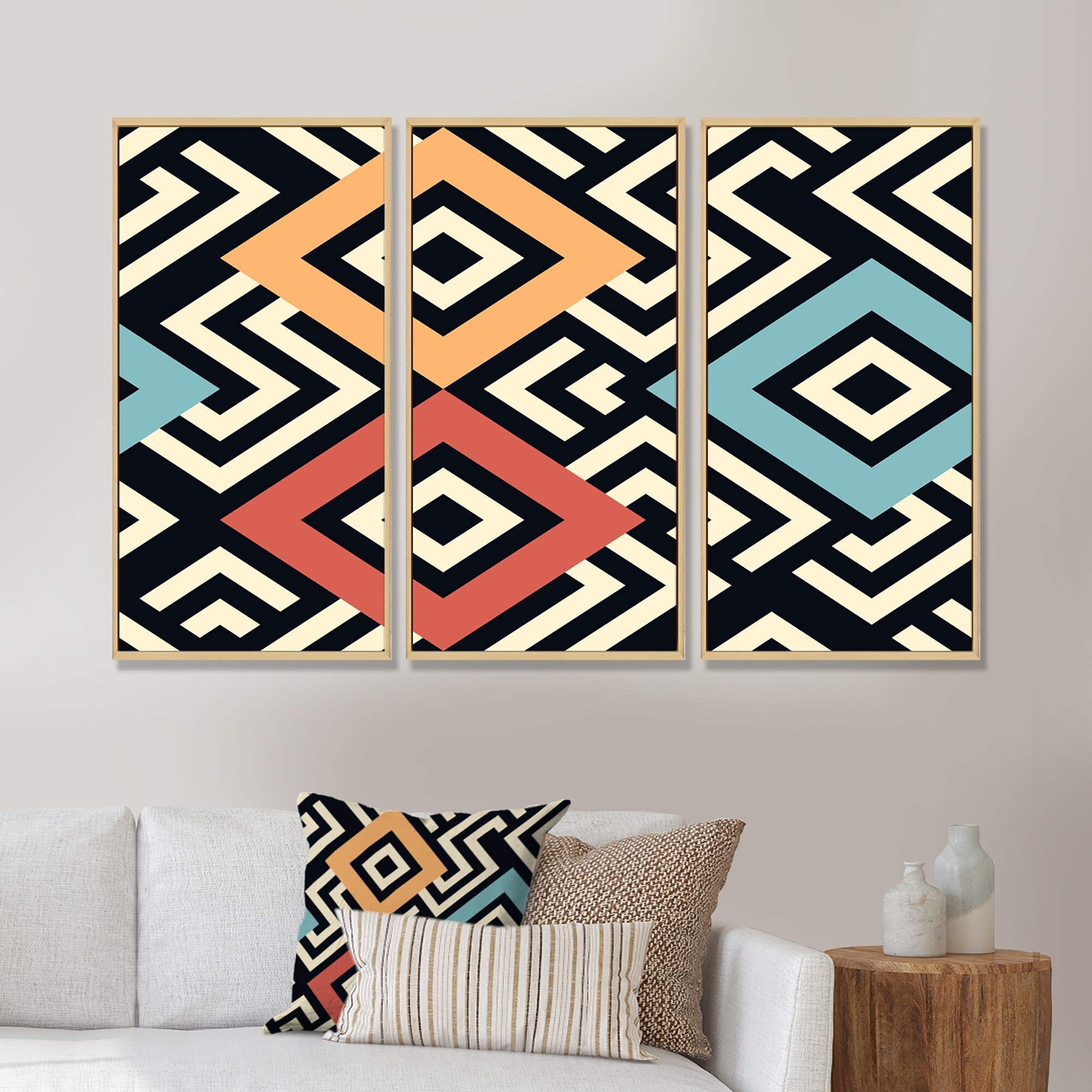 Designart "Geometric Meandering Squares, Blue Red, Orange I" Patterned Framed Canvas Wall Art Print - 3 Panels