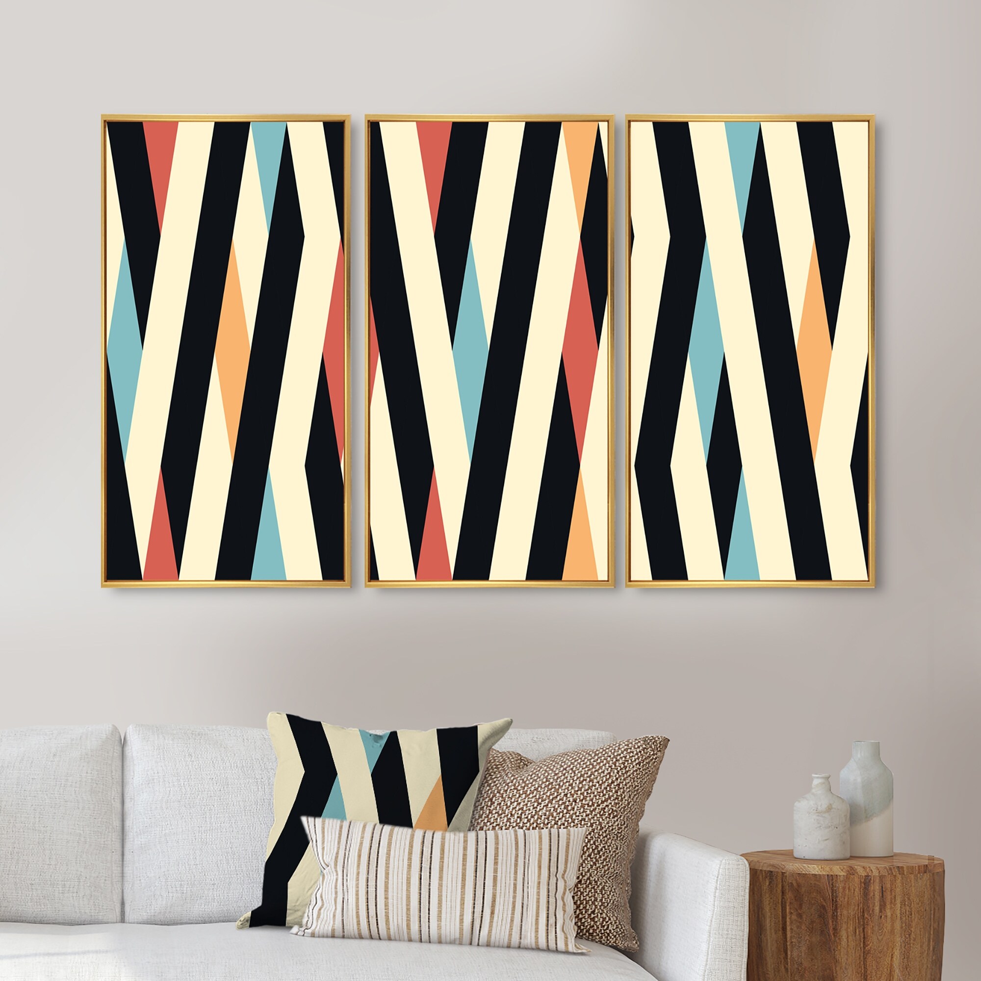 Designart "Retro Black And Beige Stripes in Blue Red, Yellow" Patterned Framed Canvas Wall Art Set of 3 - 4 Colors of Frames