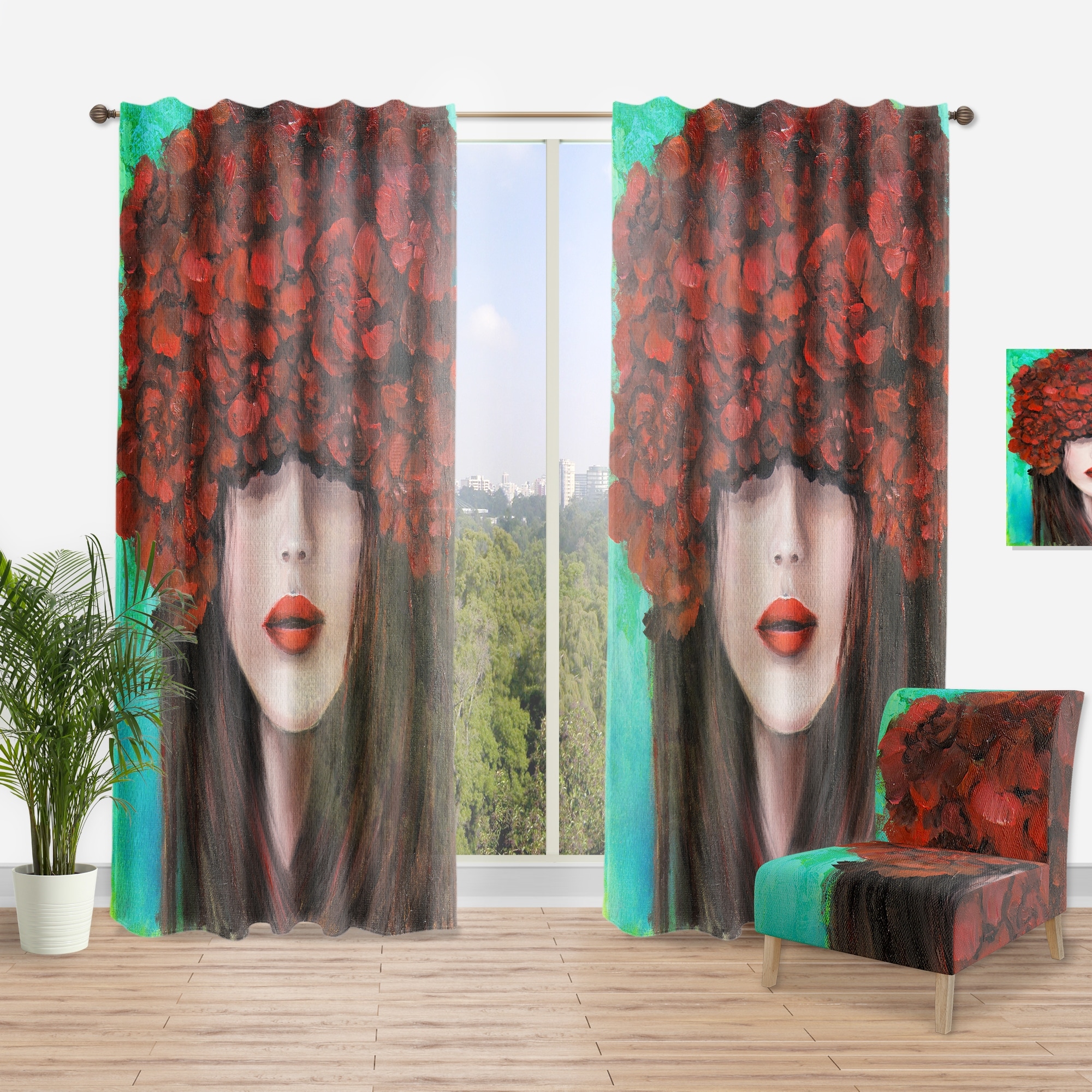 Designart 'Portrait Of a Young Woman With Red Flowers' Modern Curtain Single Panel