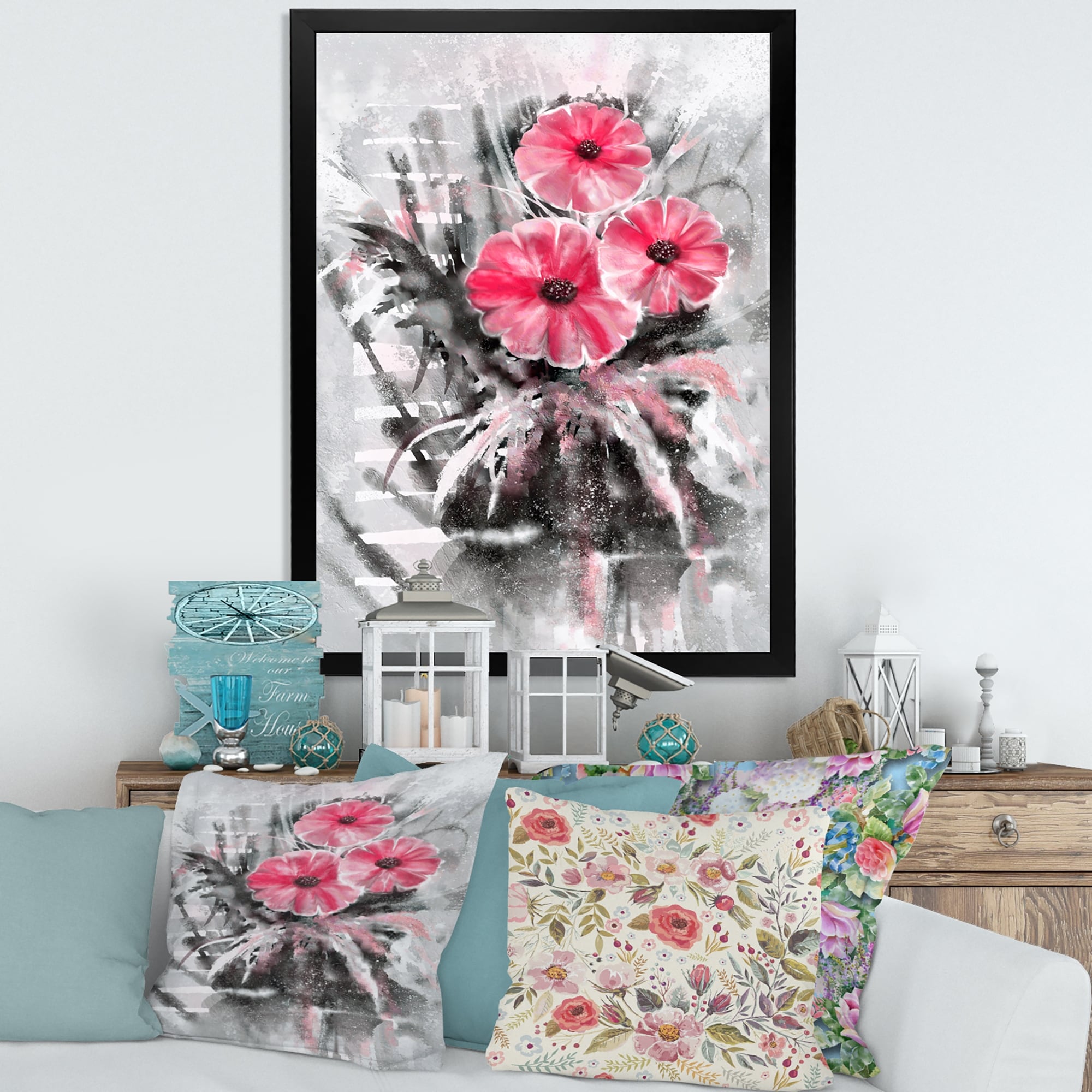 Designart "Abstract Red Flowers on Gray" Traditional Framed Art Print