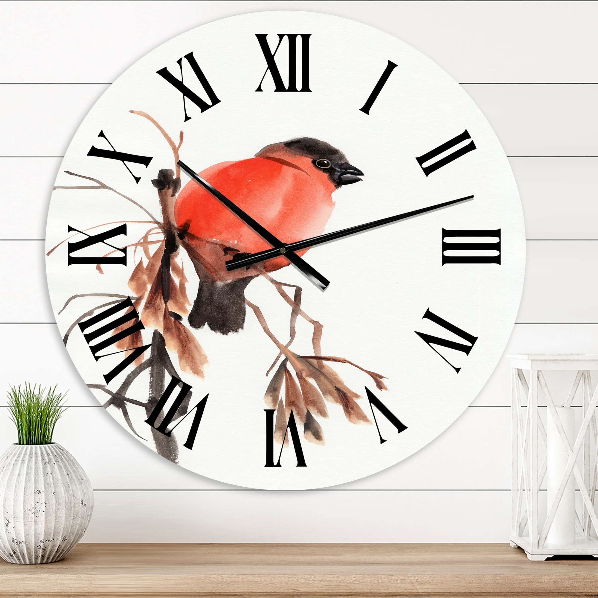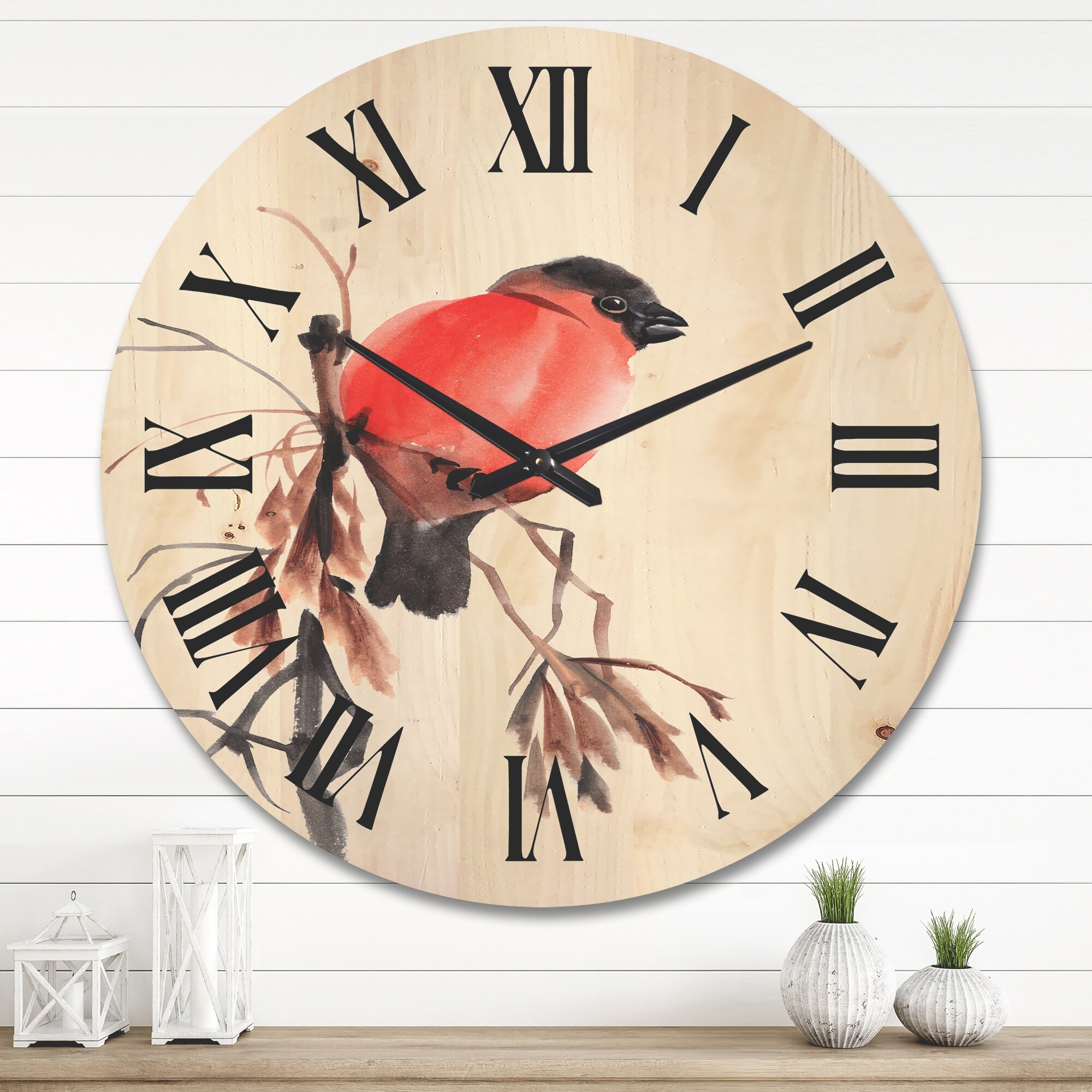 Designart 'Red Bullfinch Bird on A Branch' Traditional Wood Wall Clock