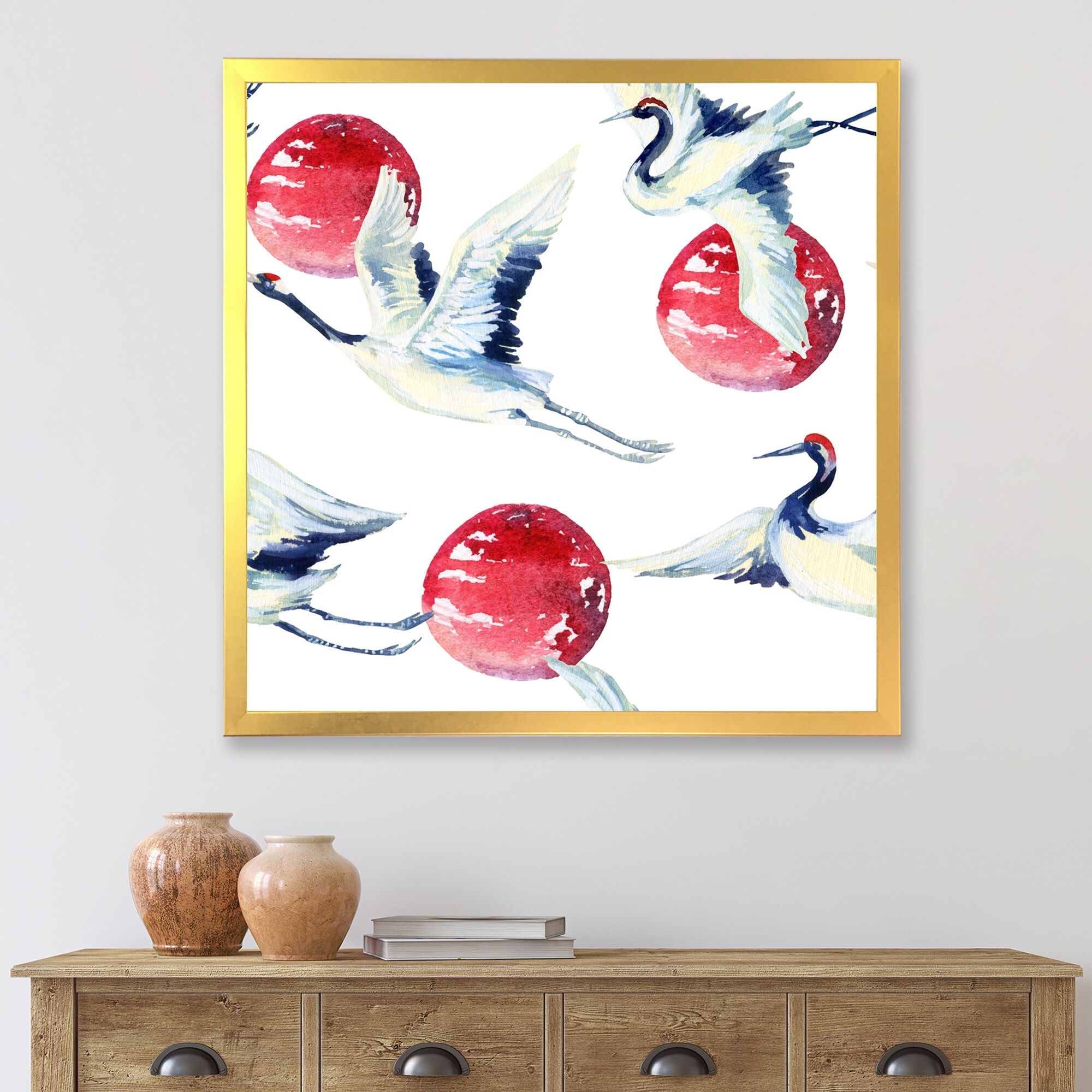 Designart "Asian Crane Bird With Red Full Moon" Traditional Framed Art Print