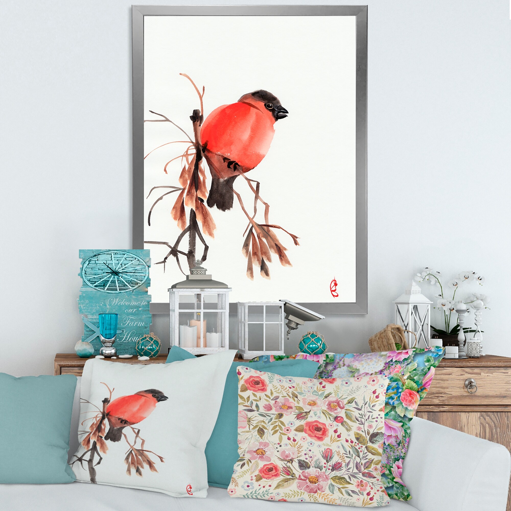 Designart "Red Bullfinch Bird on A Branch" Traditional Framed Art Print