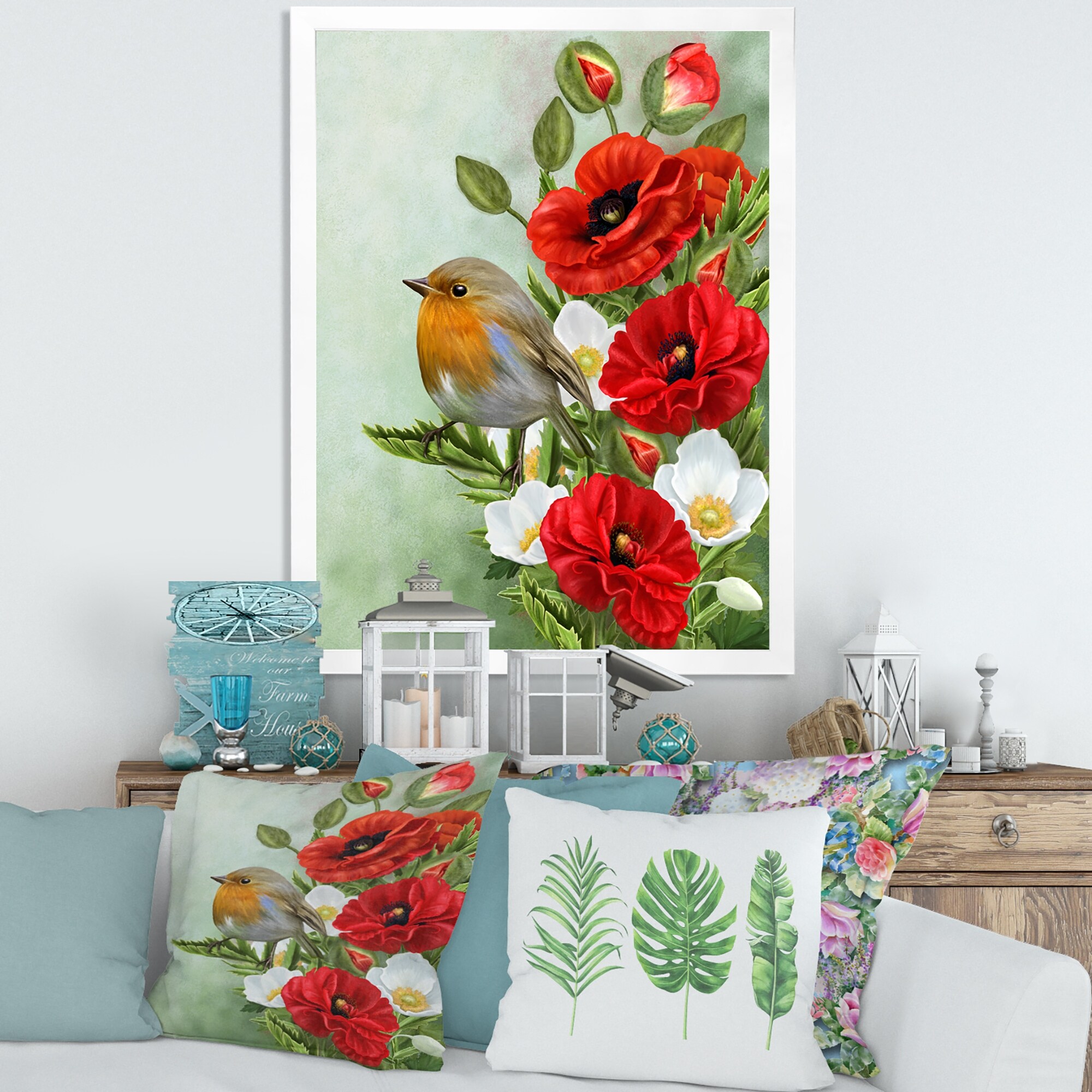 Designart "Yellow Bird With Red Poppies and White Anemones" Traditional Framed Art Print