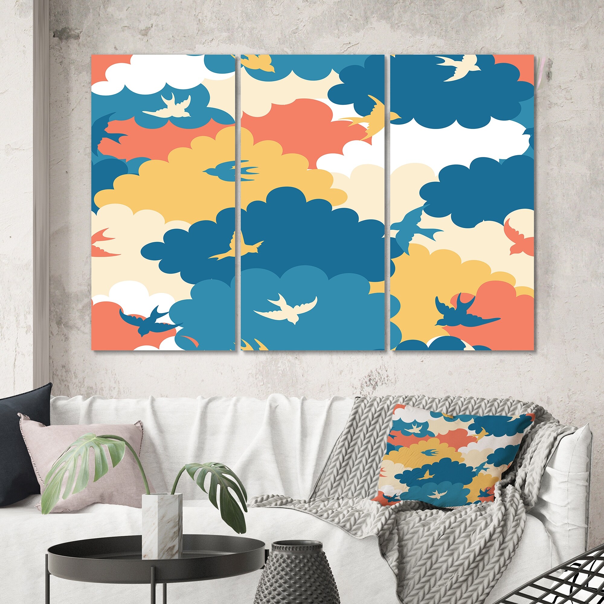 Designart "Red Blue And Yellow Clouds With Little Birds" Patterned Canvas Wall Art Print