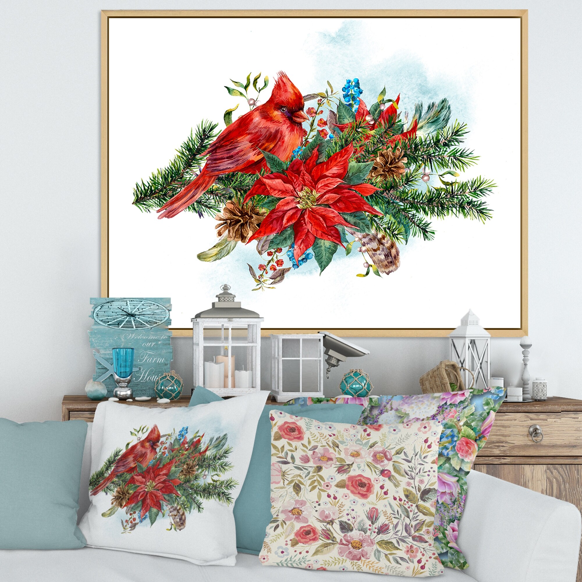 Designart "Christmas Poinsettia and Red Cardinal Bird" Traditional Framed Canvas Wall Art Print