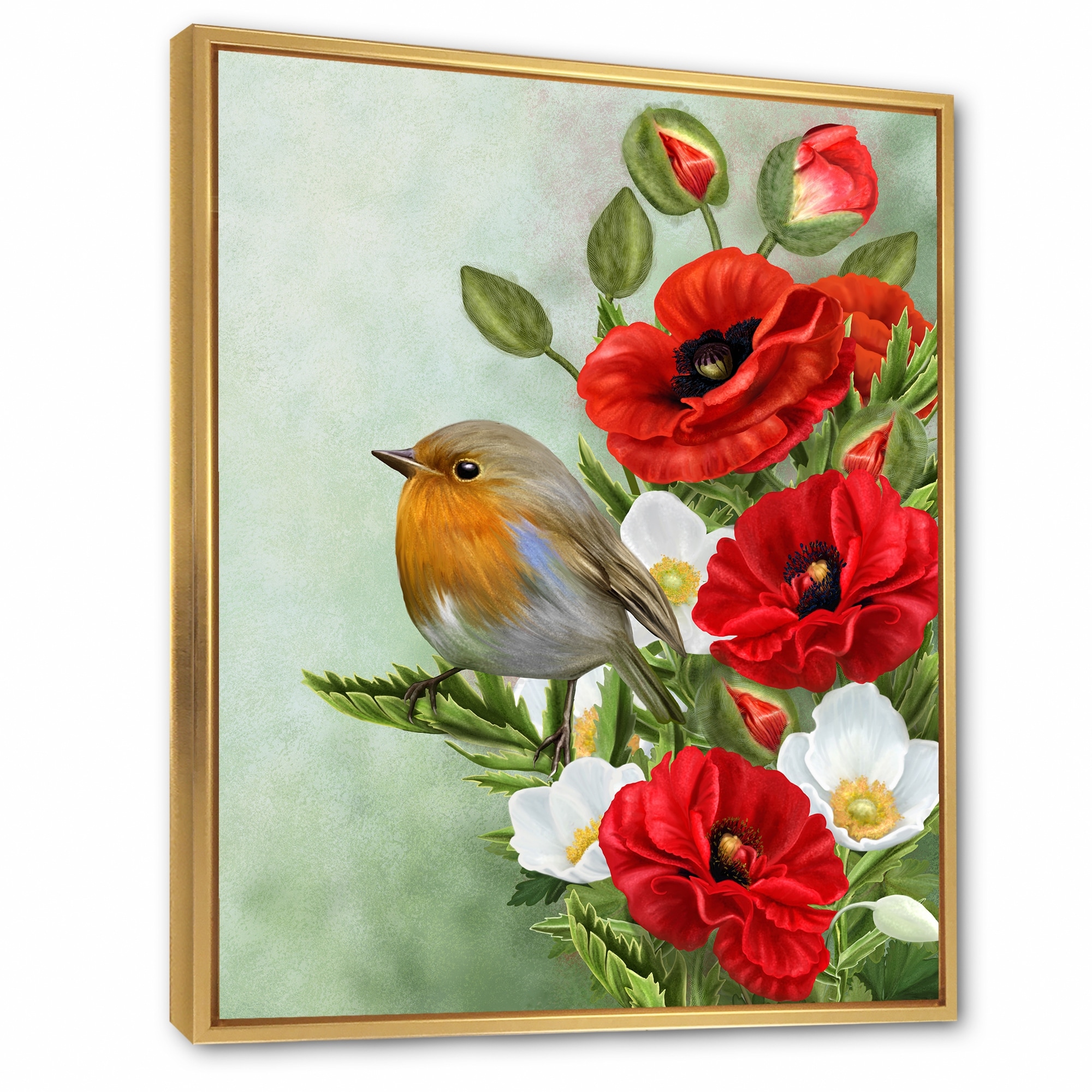 Designart "Yellow Bird With Red Poppies and White Anemones" Traditional Framed Canvas Wall Art Print