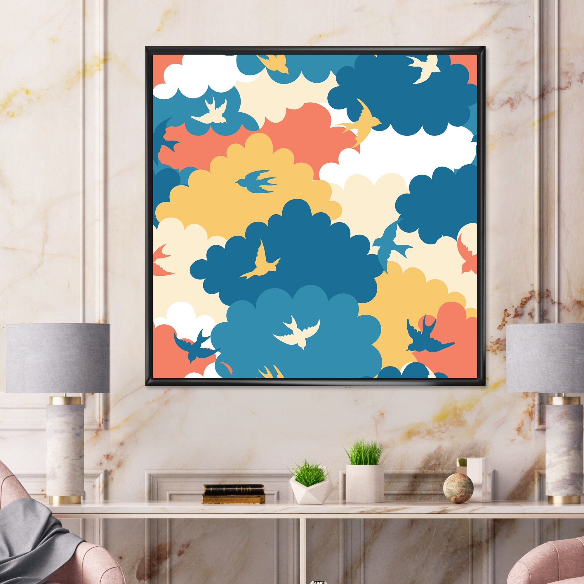 Designart "Red Blue And Yellow Clouds With Little Birds" Patterned Framed Canvas Wall Art Print