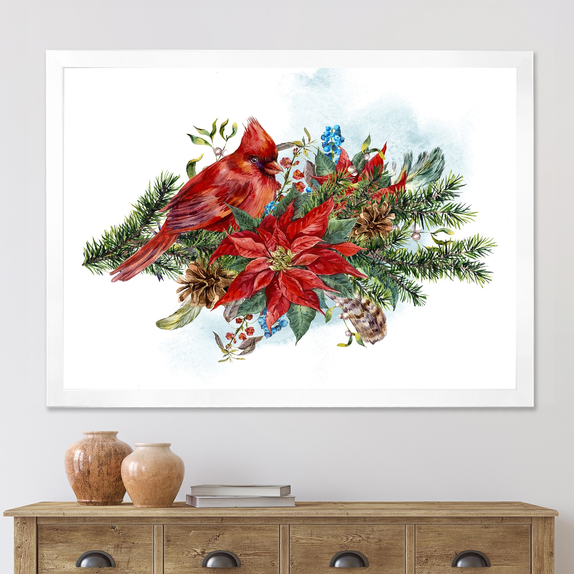Designart "Christmas Poinsettia and Red Cardinal Bird" Traditional Framed Art Print