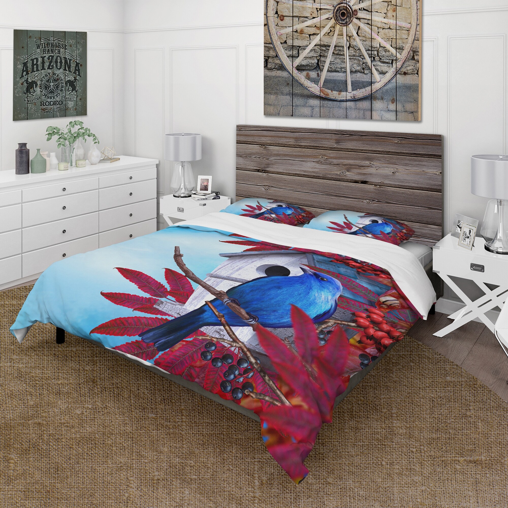 Designart 'Little Blue Bird Sitting on Red Leaves Branch' Country Duvet Cover Set