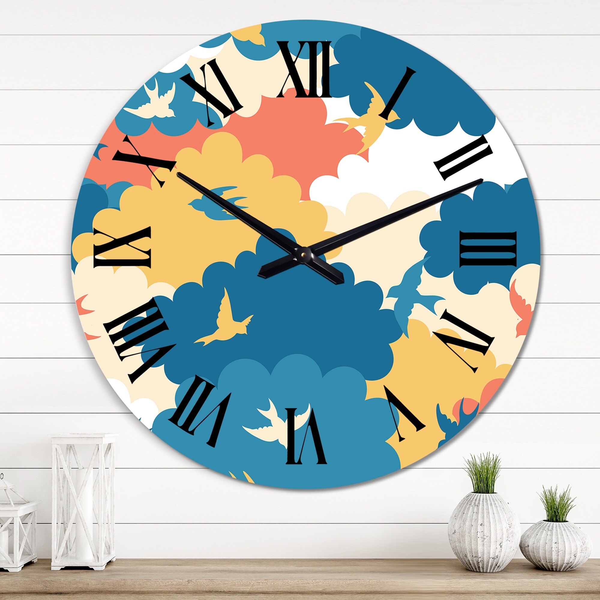 Designart 'Red Blue And Yellow Clouds With Little Birds' Patterned wall clock