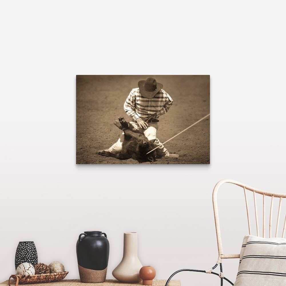 "Cowboy roping calf" Canvas Wall Art