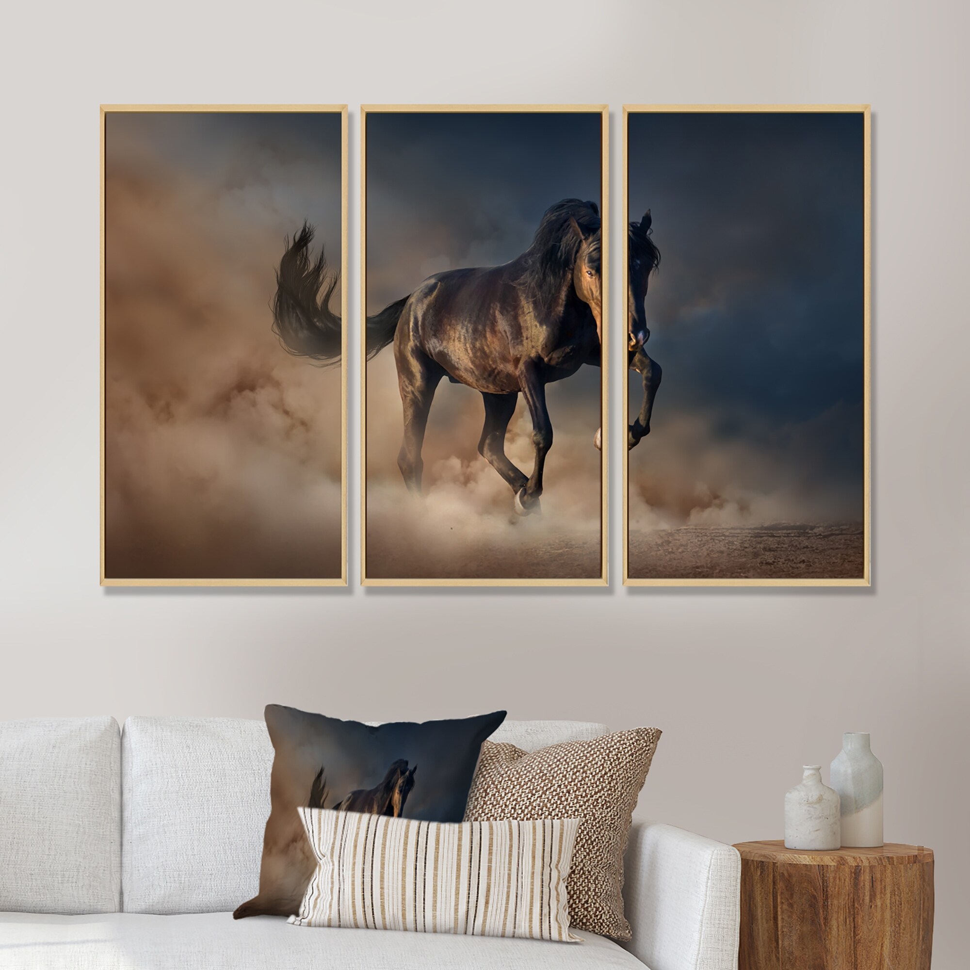 Designart "Black stallion horse Running Wild" Animal Framed Art Prints Set of 3 - 4 Colors of Frames