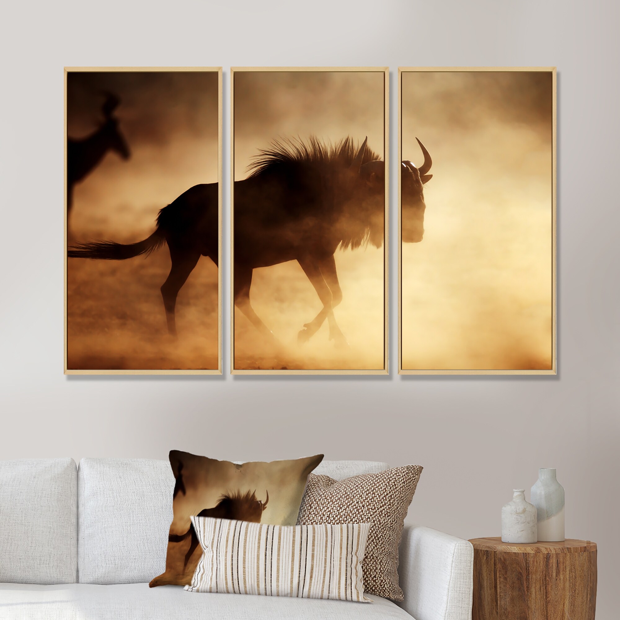 Designart "Blue Wildebeest Running in Dust" Animal Framed Wall Art Set of 3 - 4 Colors of Frames