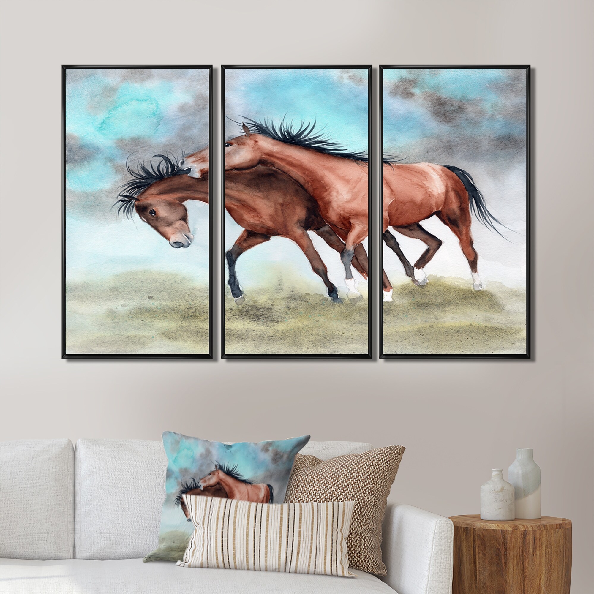 Designart "Two Running Playful Brown Horses on A Blue" Traditional Framed Canvas Wall Art Set of 3 - 4 Colors of Frames