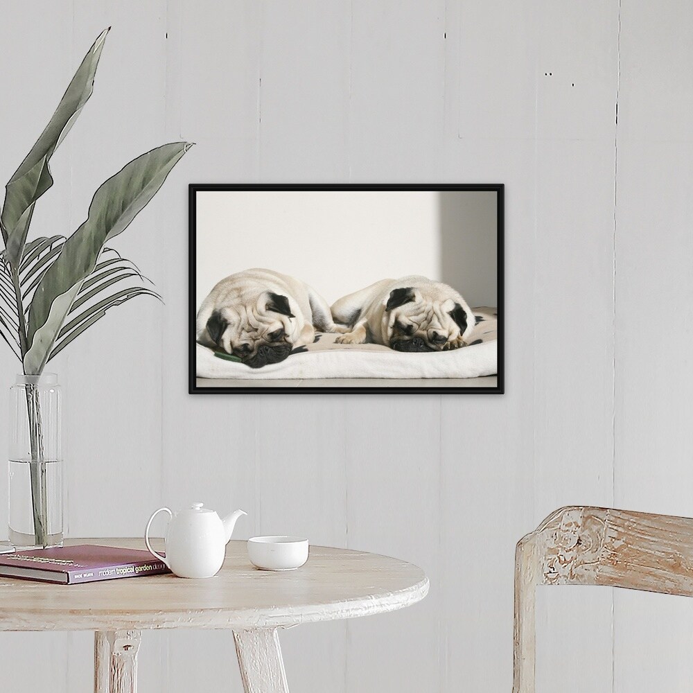 "Sleeping pugs resting in sun." Black Float Frame Canvas Art