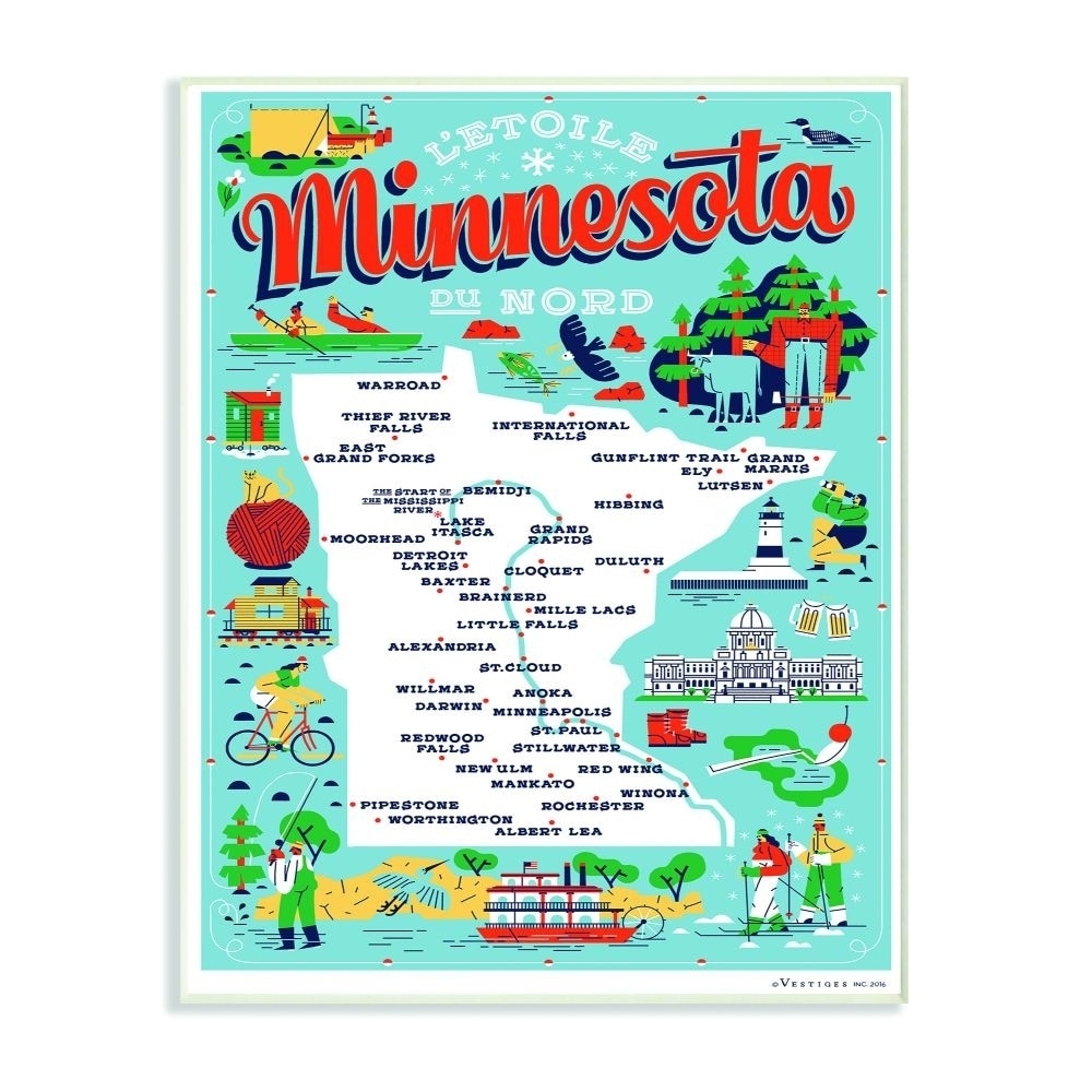 Stupell Minnesota Light Blue and Red Illustrated Scenic Map Poster Wall Plaque Art, 10x15, Proudly Made in USA