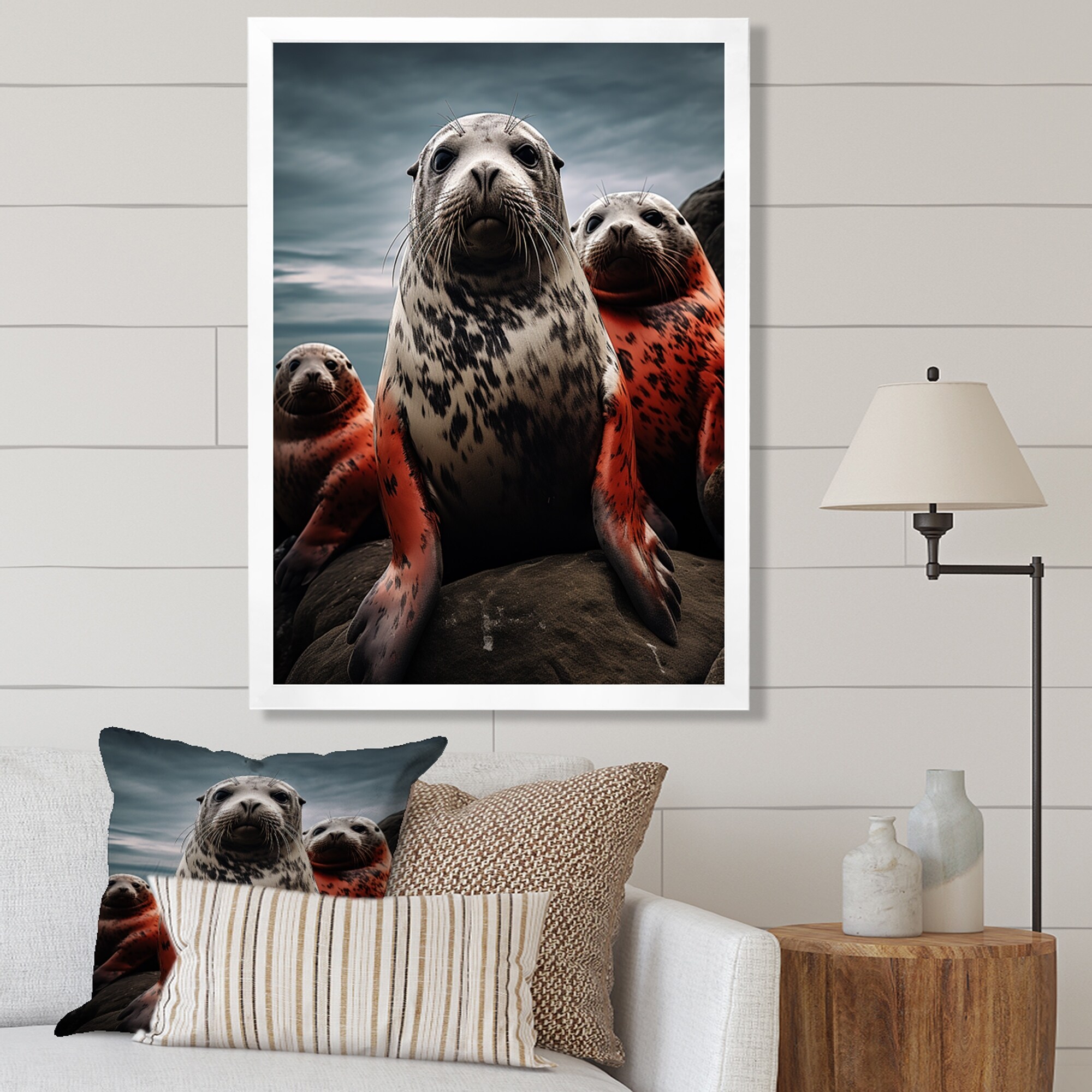 Designart "Grey Red Seal Silent Guardians" Marine Animals Framed Canvas Wall Art