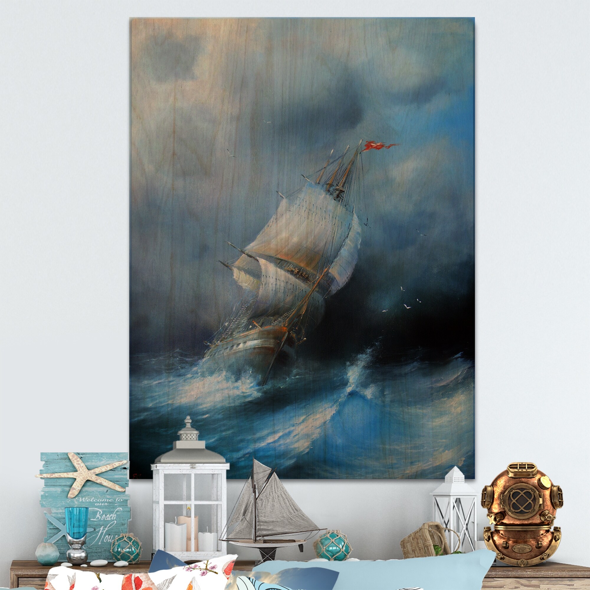 Designart "Ship In the Middle of a Storm I" Modern Landscape Beach Framed Wall Art for Living Room